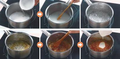 制作焦糖酱,是利用了糖的焦化性质。糖在高温的时候会发生焦化反映,产生金黄到棕色的颜色,也产生具有特殊风味的物质。煮焦糖的步骤很简单,先在糖里加入少许水使糖溶解,再加热到糖发生焦化就可以了。不过,这时候的糖直接冷却以后会变成坚硬的焦糖块。为了让焦糖冷却以后变成可以流动的“焦糖酱”,就需要在糖焦化以后加入一定的开水,混合均匀,冷却后就不会是硬糖块了。