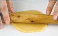 将准备好的甜塔皮擀成厚0.4厘米片状,将塔皮衬入模具,用手按压塔皮,将塔皮均匀地贴住模具的内部。