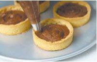 制作巧克力酱:将黑巧克力和鲜奶油混合隔水加热熔化;黄油和糖粉混合打发,加巧克力酱,搅匀。巧克力酱均匀地挤一层在烤好的塔皮里。