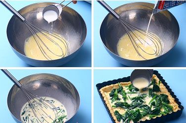 鸡蛋打散,加入鲜奶油、牛奶、盐、黑胡椒、糖和菠菜段搅拌成菠菜馅。