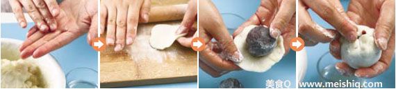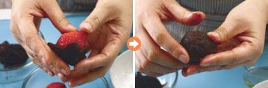 将豆沙馅取约15克,在手中按压成圆片状,再包裹草莓,制成豆沙草莓馅。