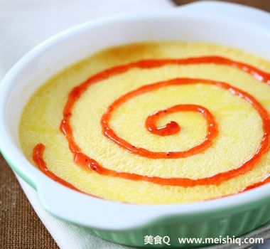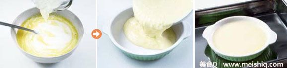3、水浴就是炖烤,在模具外的烤盘放些水,水位到模具的一半高度即可。水浴能是使烘烤的食物保持软嫩和湿润的口感。