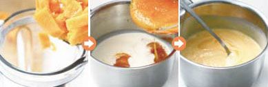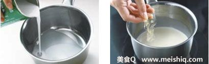 再将椰浆、牛奶和糖放入锅中,小火加热后放入泡软的吉利丁片,搅拌至吉利丁片完全融化即可关火。