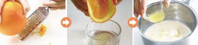 将材料B中的橙子擦皮备用,挤出橙汁与牛奶和黄油倒入容器中,混合均匀,用小火加热,搅拌均匀。