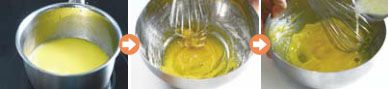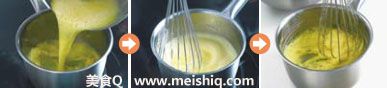 将C料蛋黄和玉米淀粉混合,搅拌均匀,然后将温热的牛奶橙汁慢慢倒入到蛋黄中,搅拌均匀。