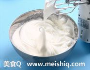 将D料蛋清、糖和柠檬汁混合,打至9分发泡。