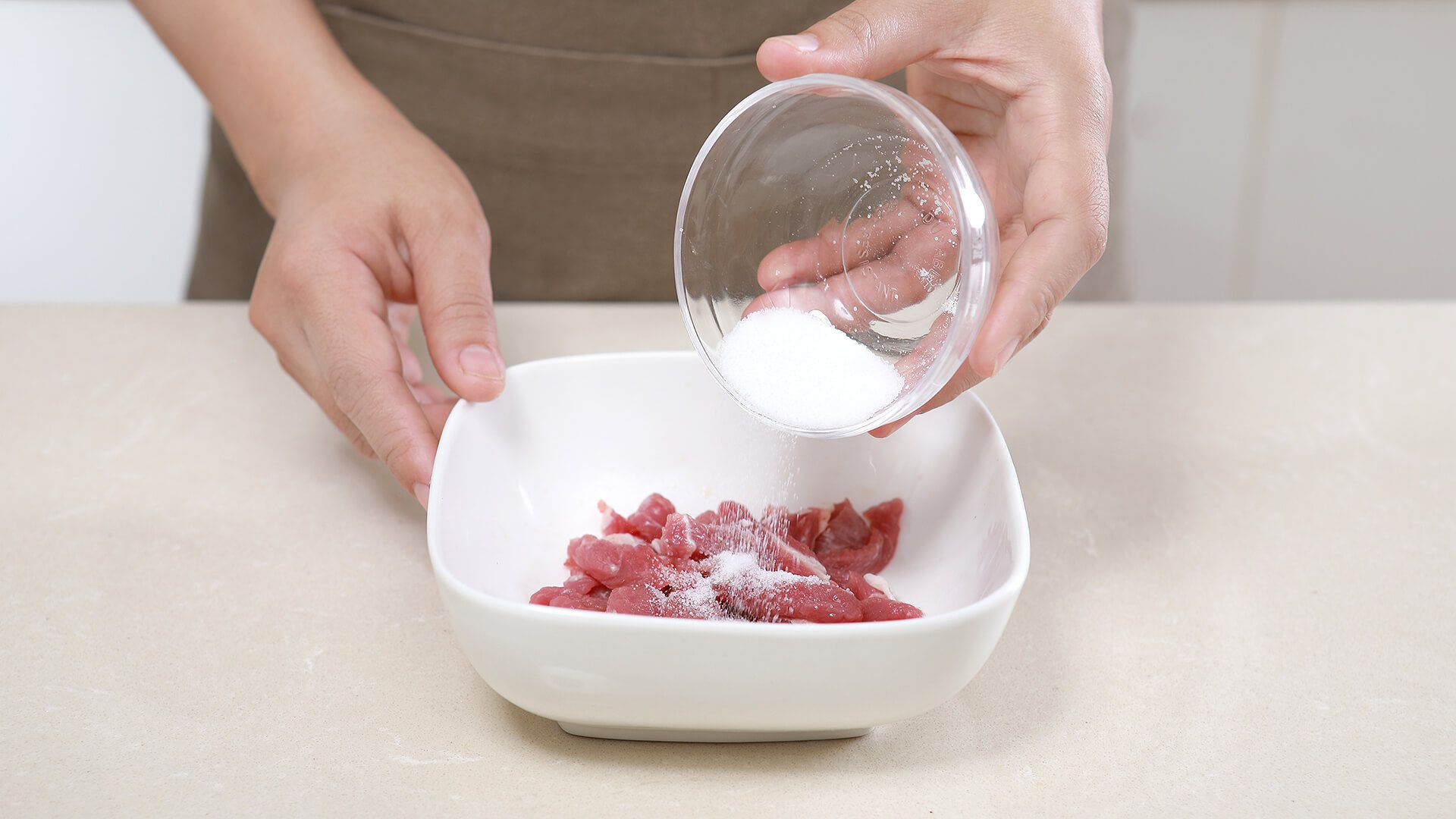 肉丝放入生抽酱油,料酒,精盐,提前腌制10分钟。