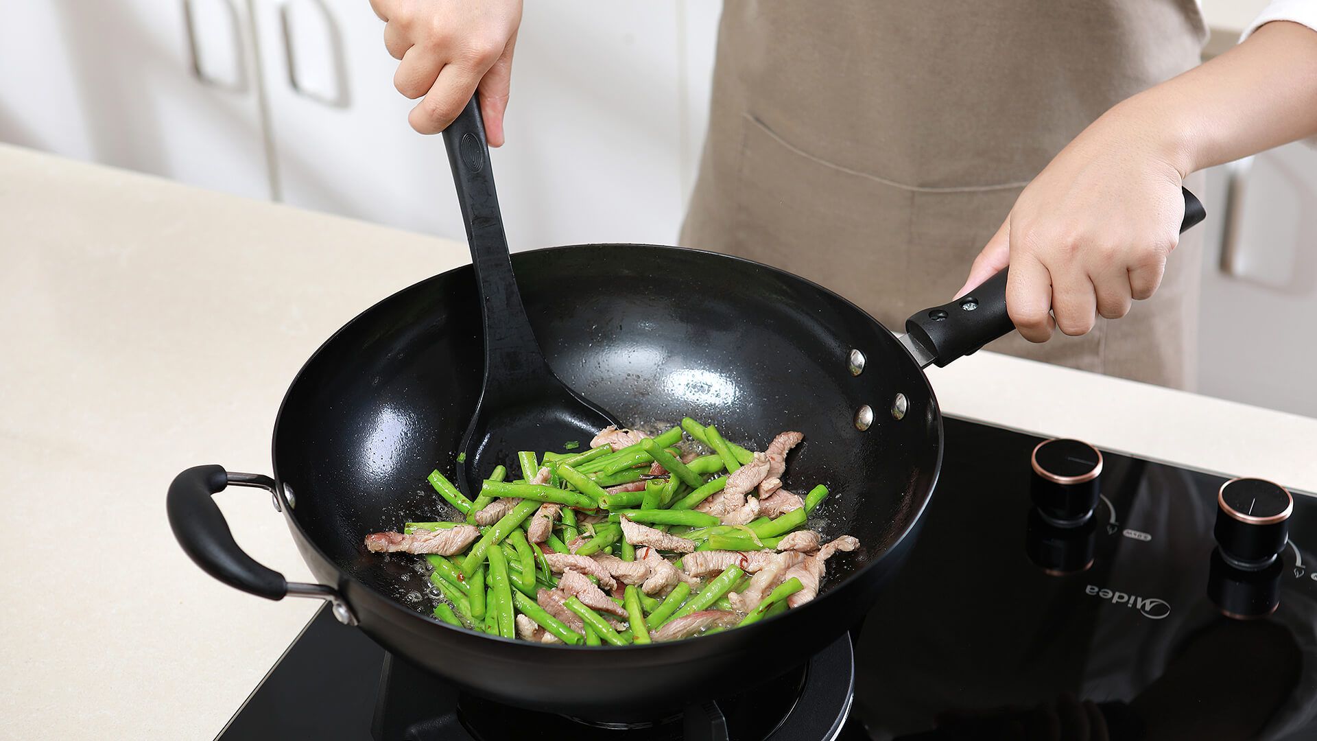 留下炒肉的底油放入豇豆炒至断生,接着填入半小碗清水,炖至软烂,放少许的精盐,十三香调味。