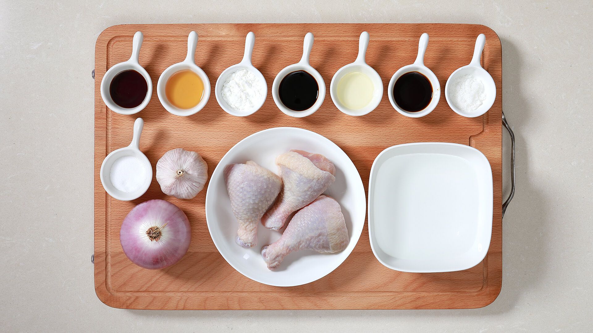 鸡腿肉放入1半的生抽酱油与料酒、淀粉抓匀腌制10分钟。