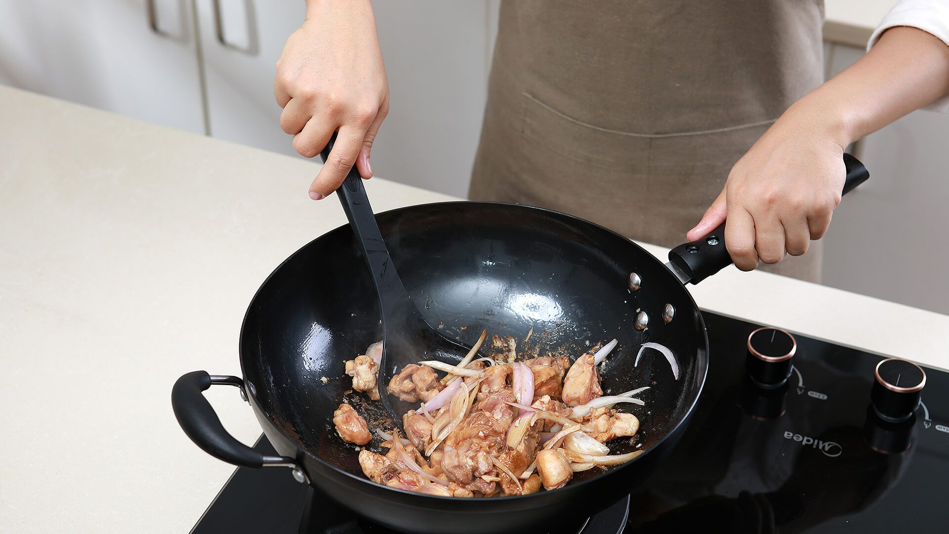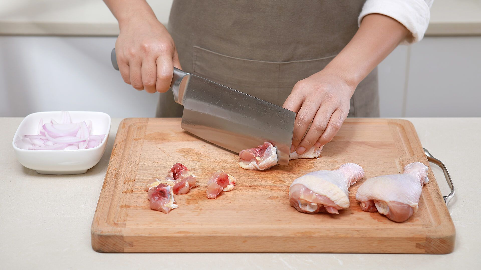 洋葱洗净切片。鸡腿肉改刀切小块。大蒜切蒜末备用!