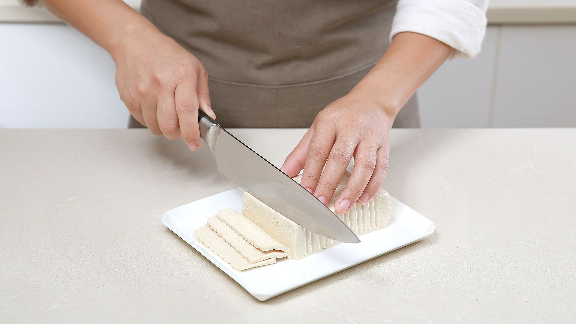 豆腐改刀成均匀的片状!如果豆腐有生味,可以先抄水再使用哦!