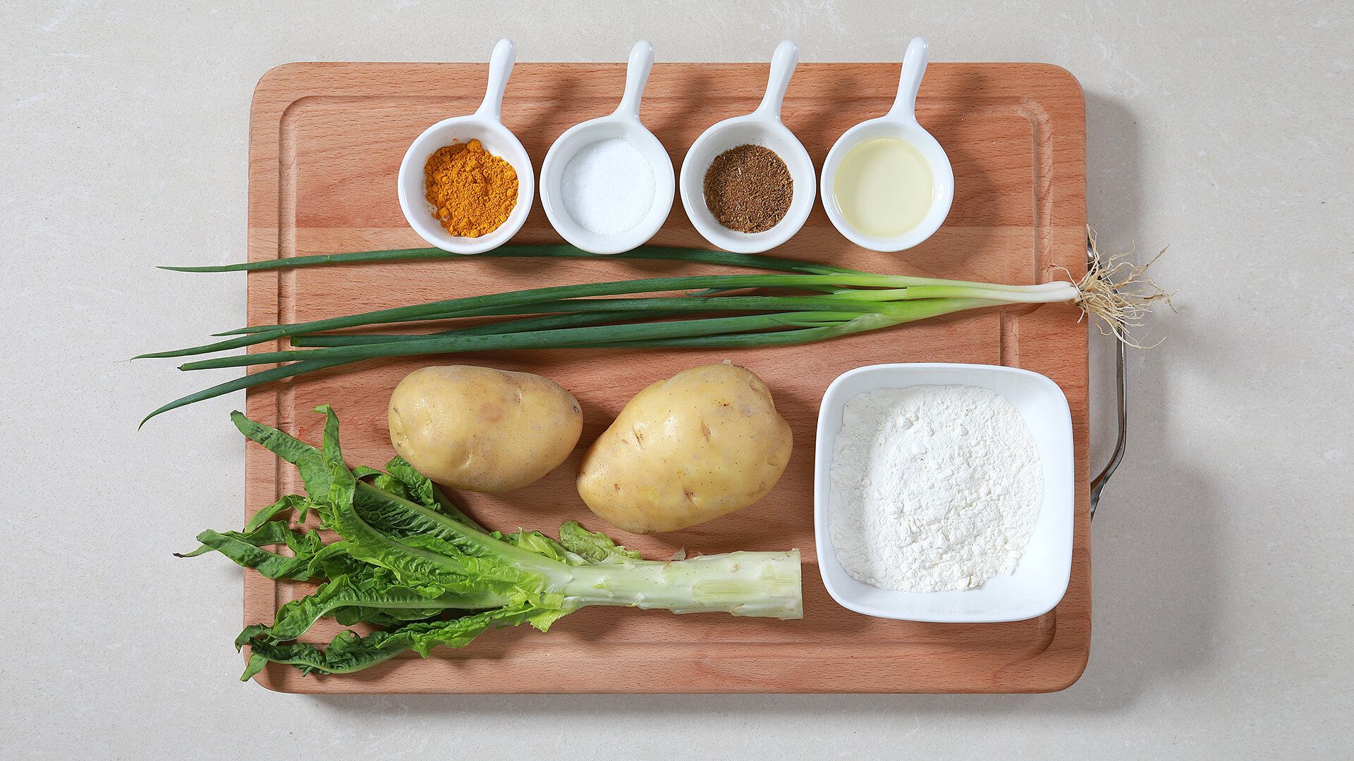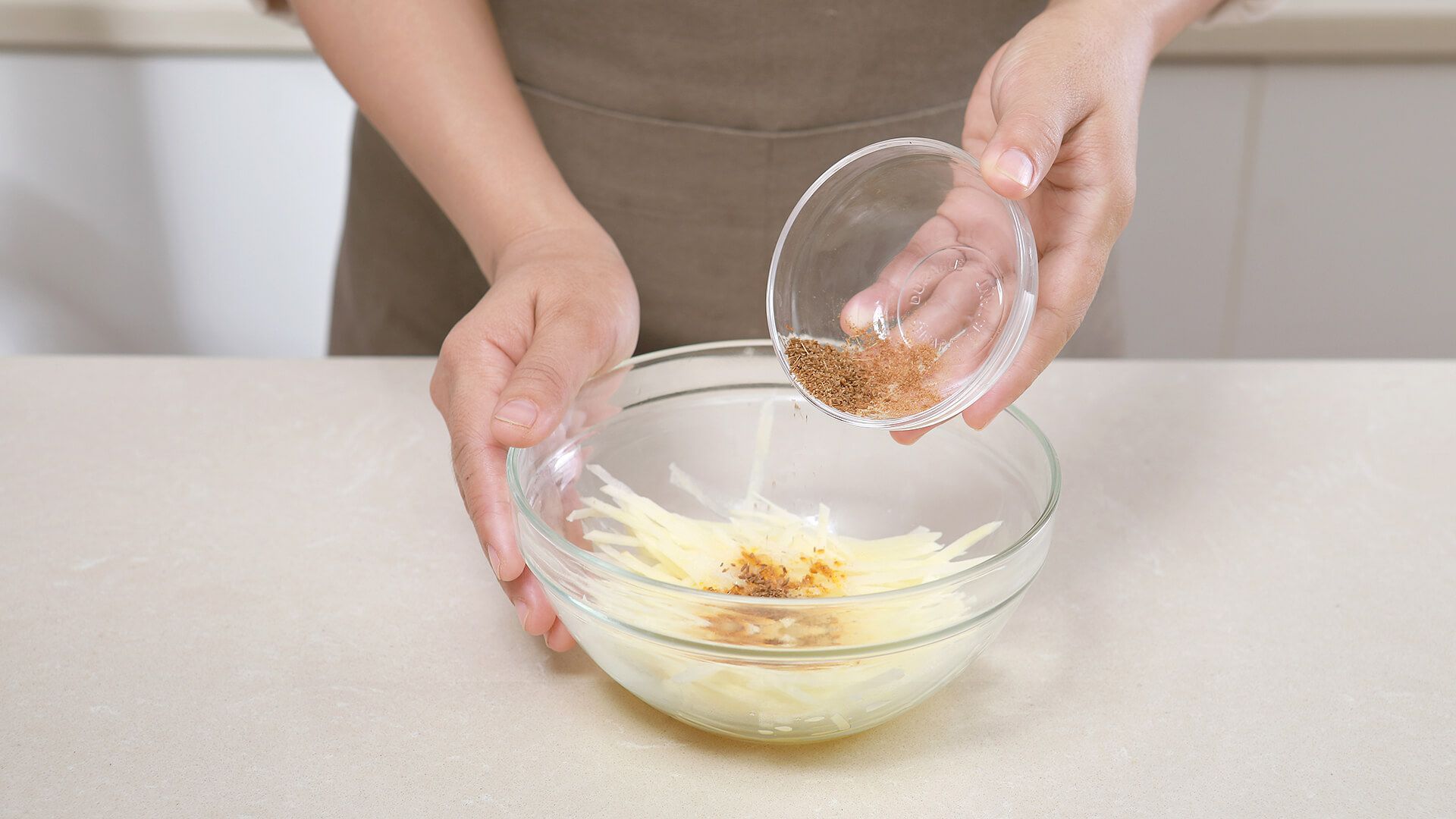 土豆去皮洗净切丝后加1茶匙孜然、咖喱粉、盐入味。