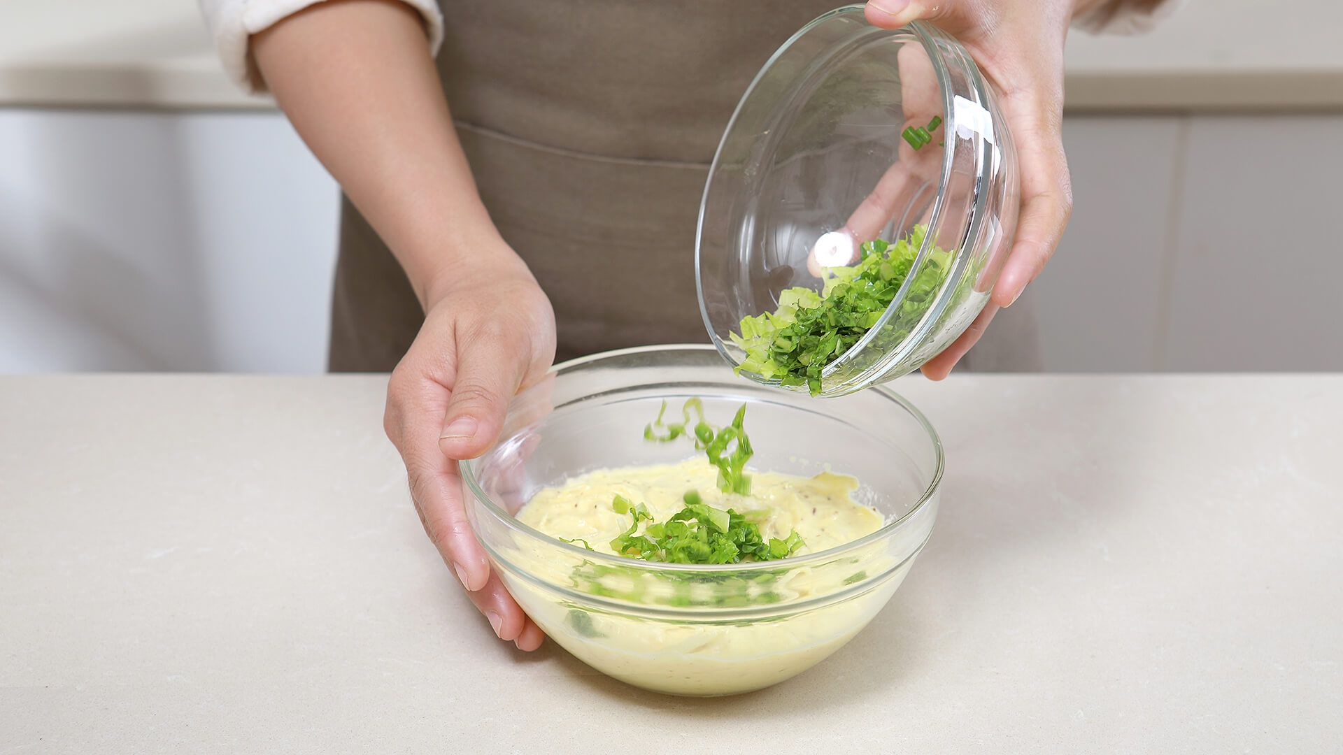 再加入面粉,拌成均匀的糊状,面糊里加些香葱和切碎的莴笋尖拌匀。
