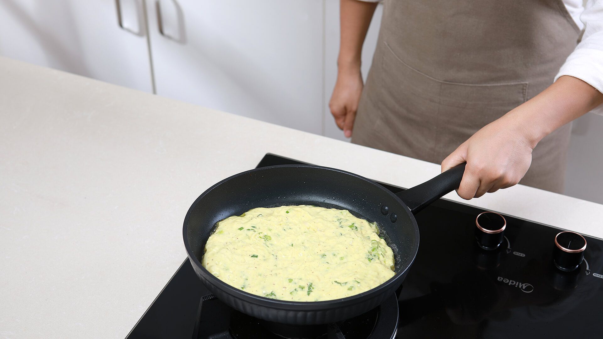 热锅加一小勺油,摊入适量的面糊晃匀,中火加热3分钟。如果是宝宝吃加入橄榄油更佳!