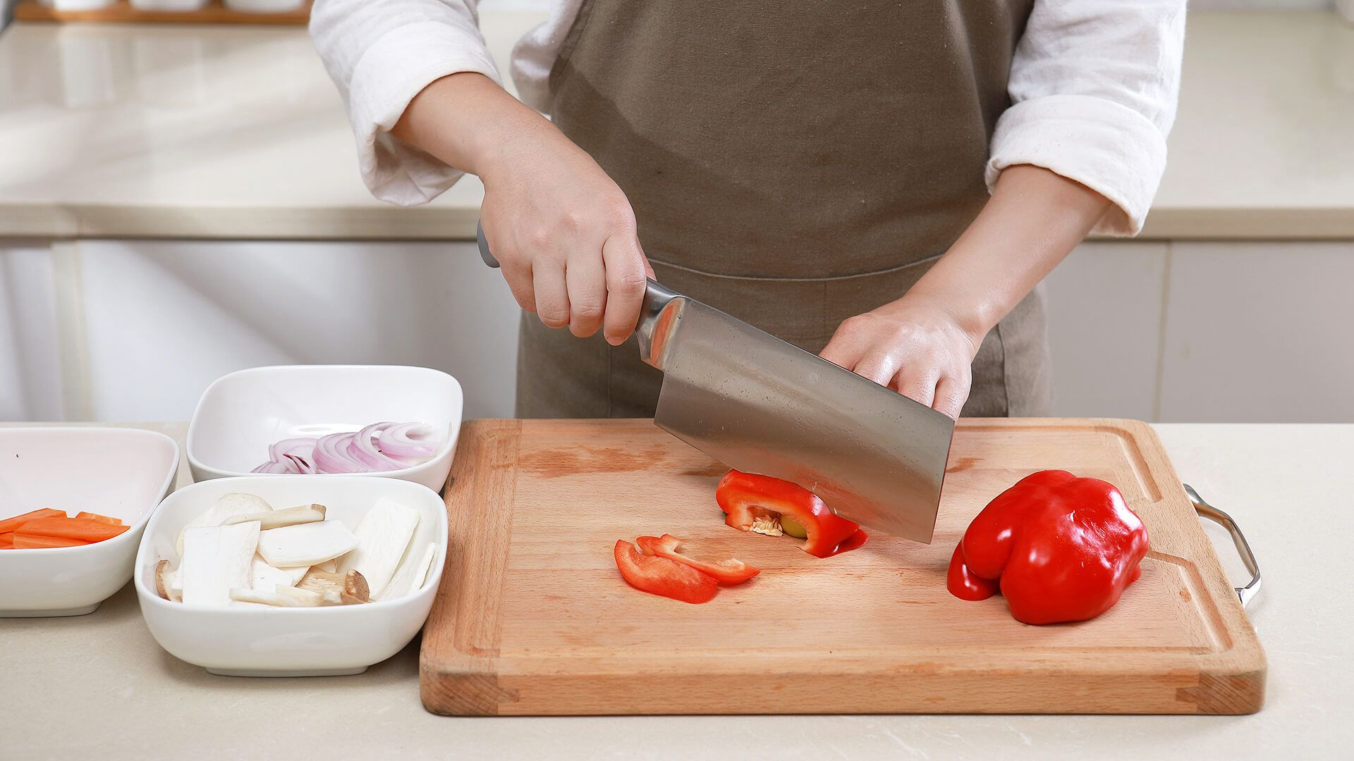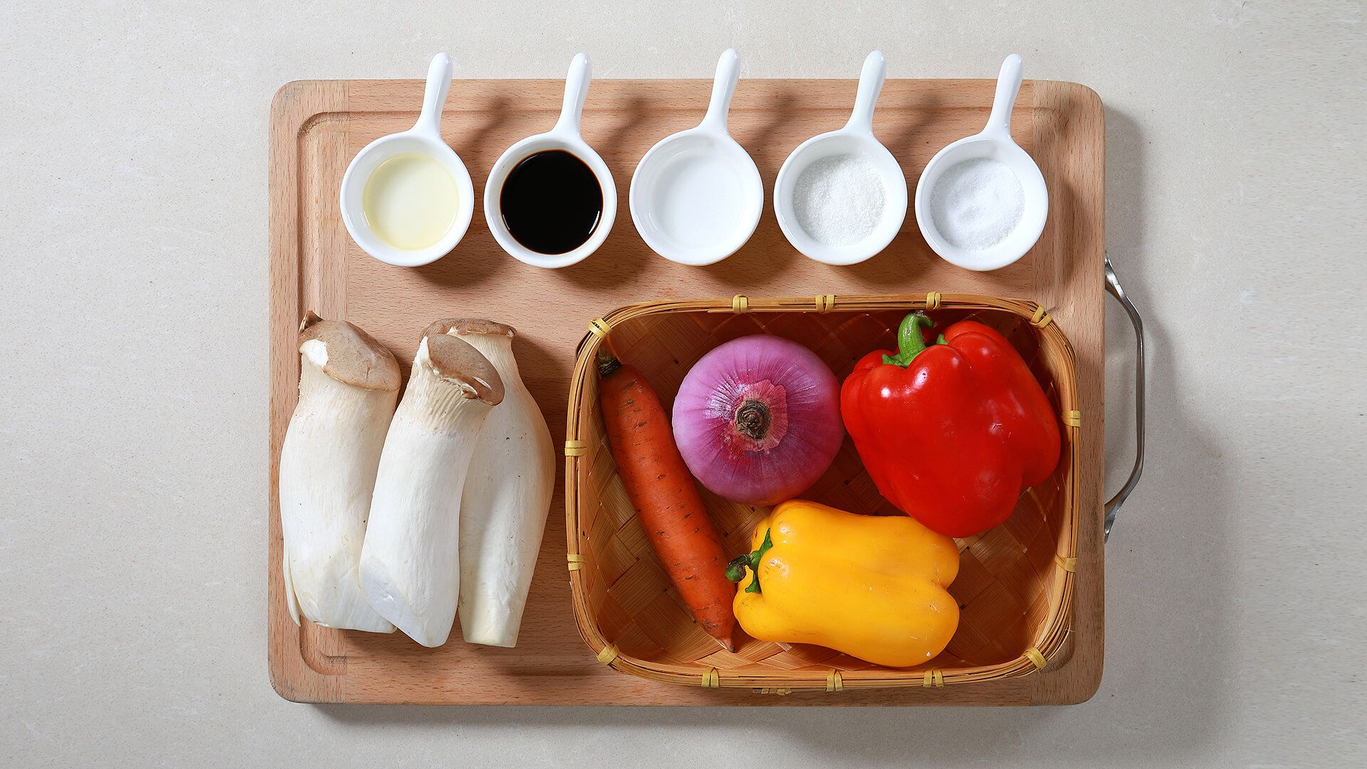 将杏鲍菇切小块,洋葱、胡萝卜切片,甜椒切片或者切滚刀备用。