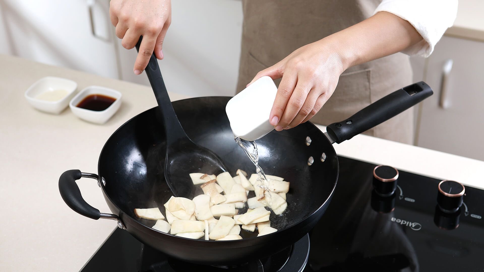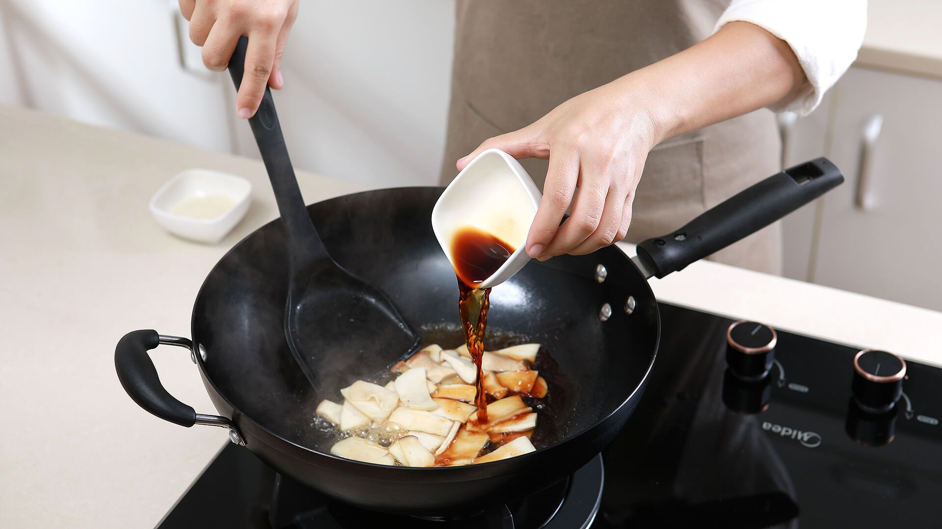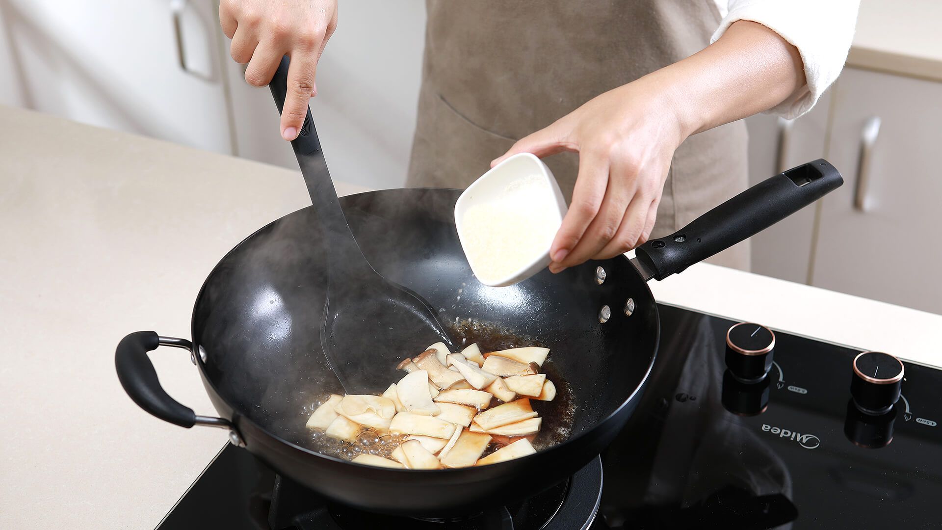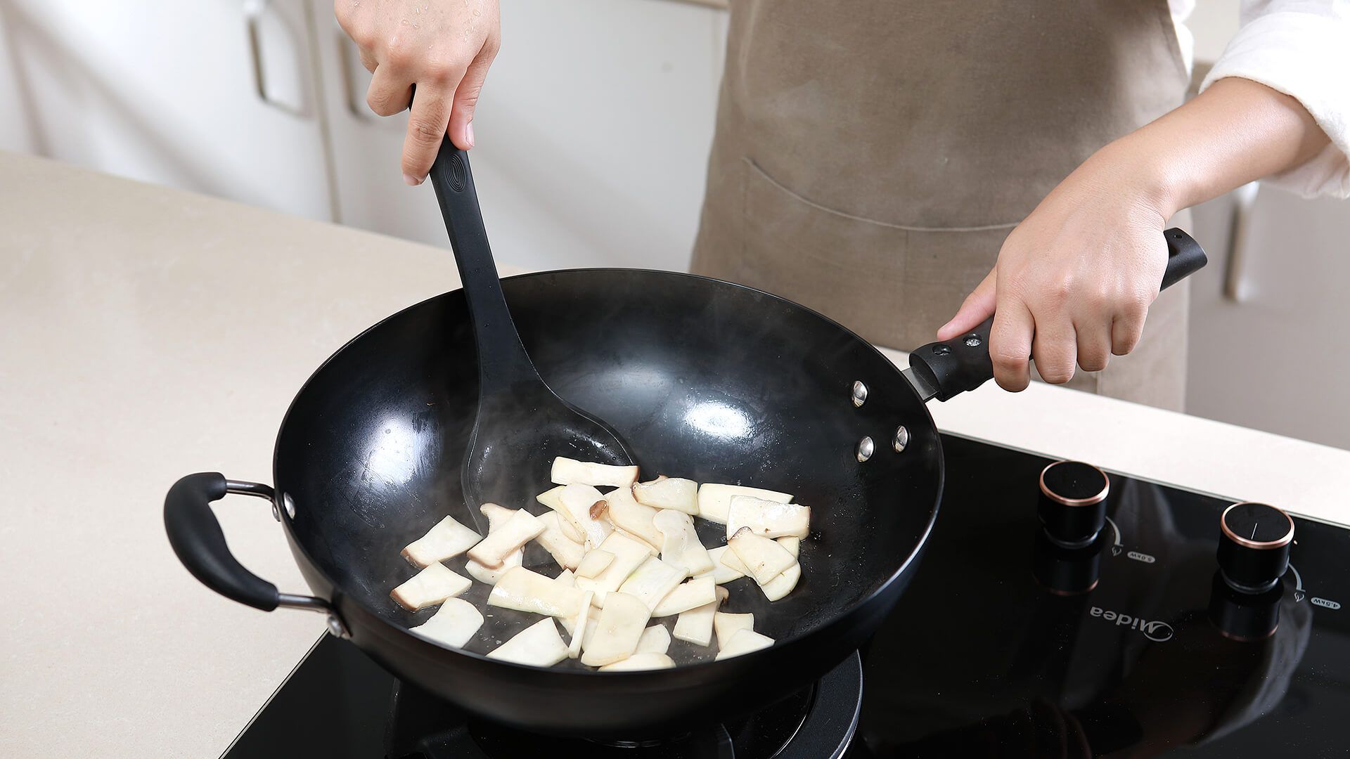 锅内倒油少许,倒入杏鲍菇翻炒,翻炒至微微变黄。