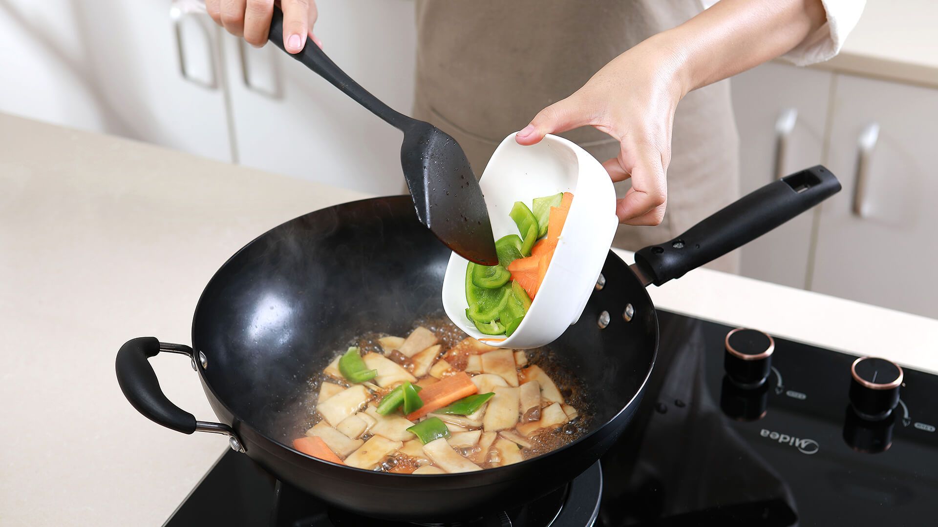 倒入青椒洋葱胡萝卜大火翻炒,最后中小火收汁颜色变浓即可。