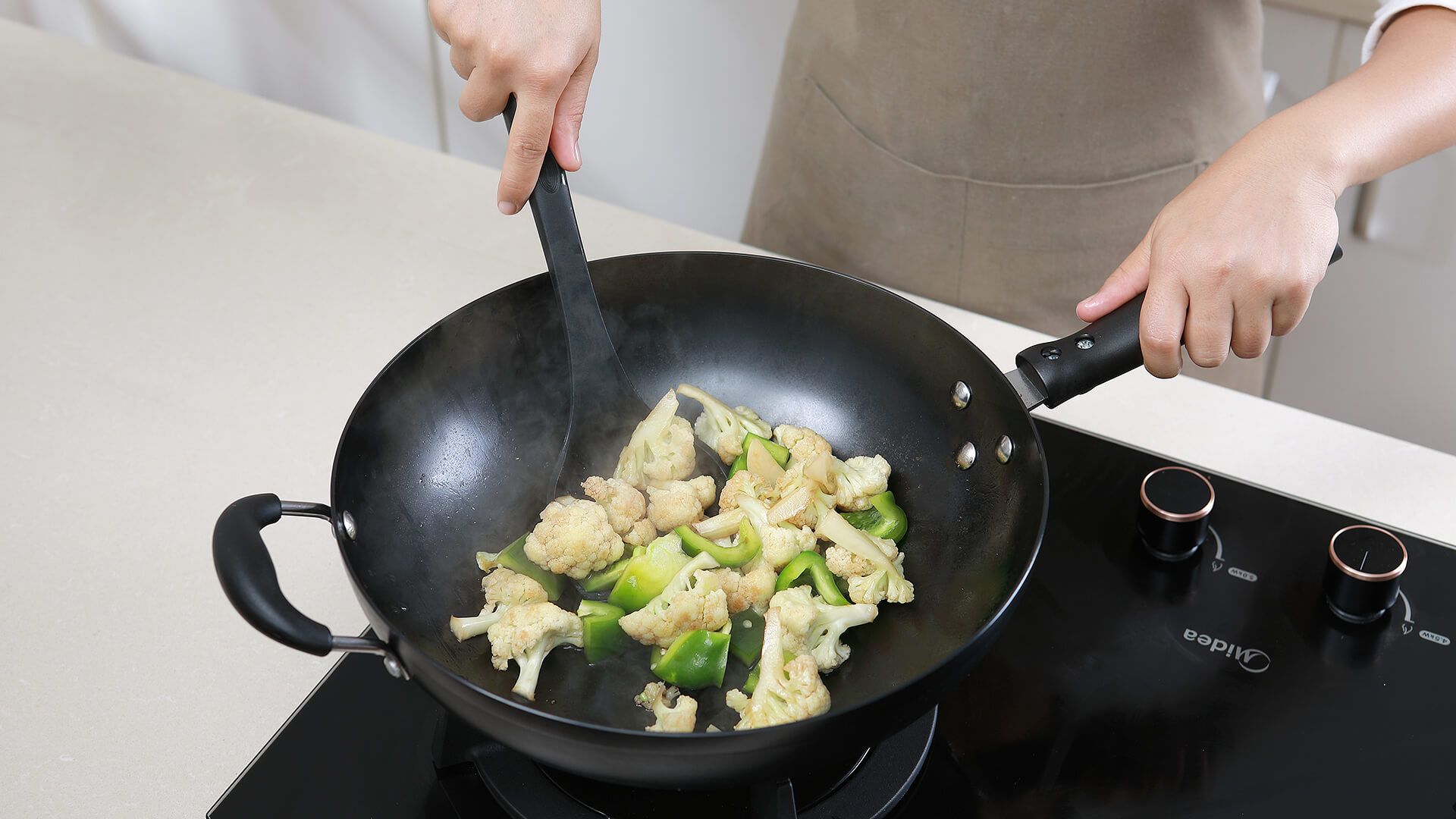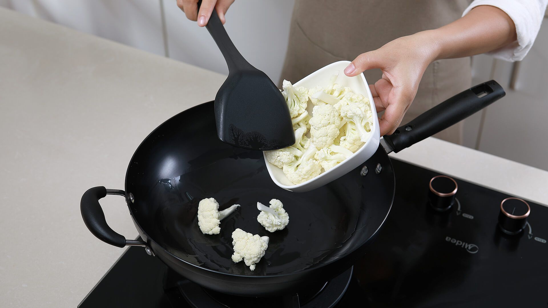 热锅冷油加热到200度放入花菜煸炒到七分熟。