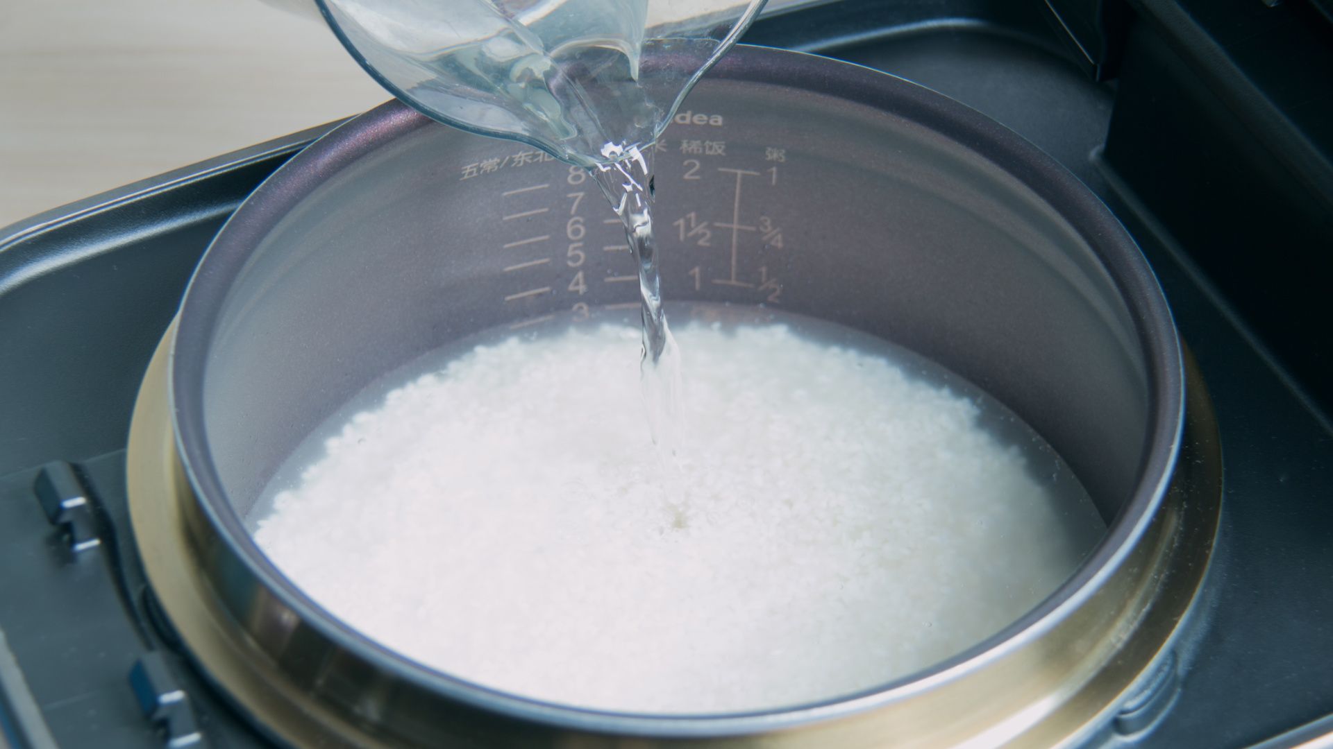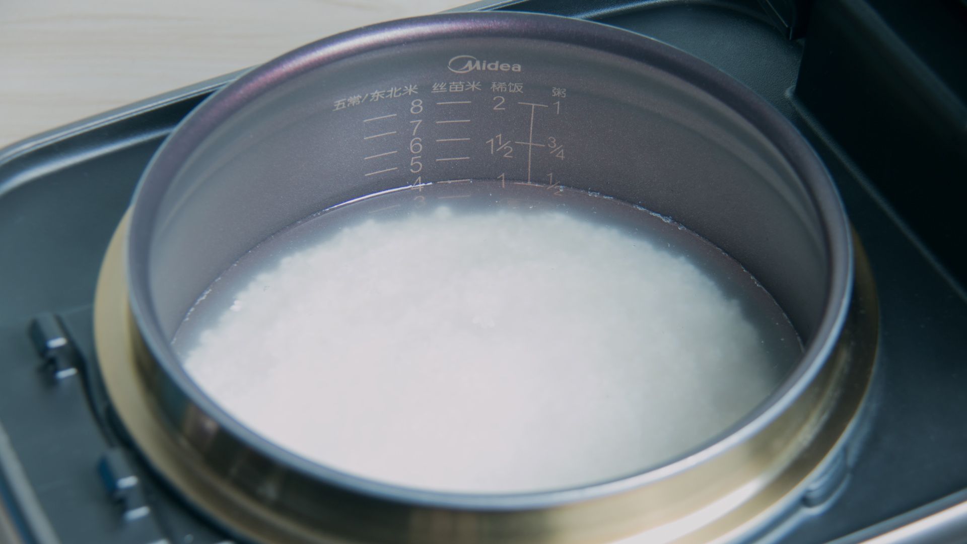注入泉水或者纯净水至煮饭2刻度水位(约400ml),合盖开始煮食。