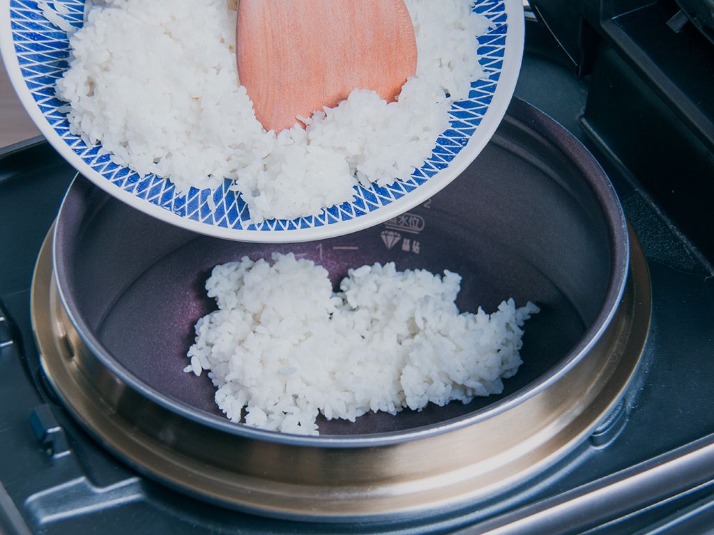 将剩米饭倒入内锅、用饭勺打散铺平。