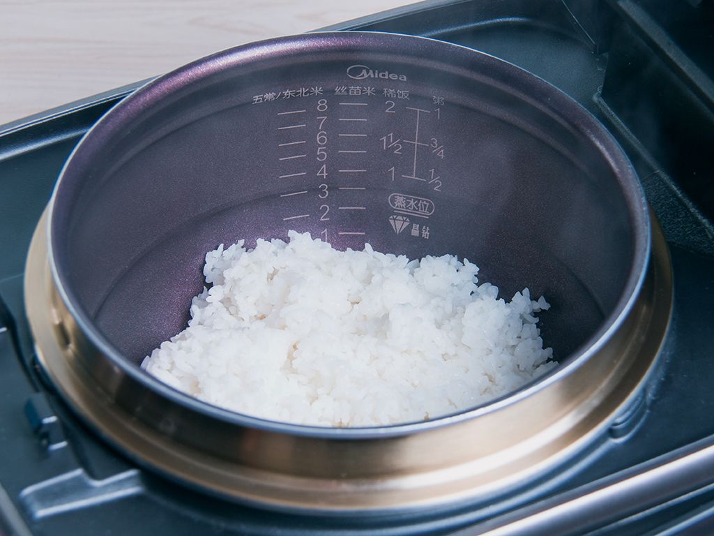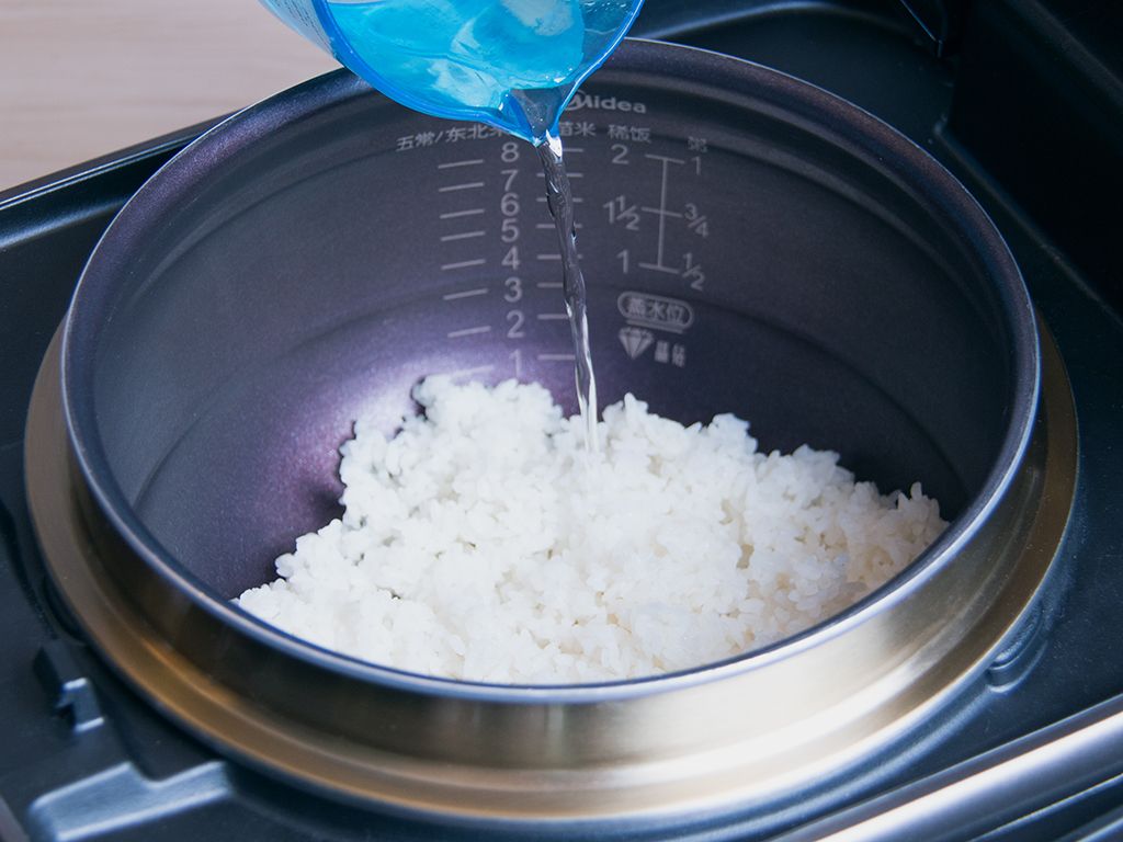将1/4杯清水(约50g)均匀的洒在米饭表层。(水量可根据米饭大小适当增加)