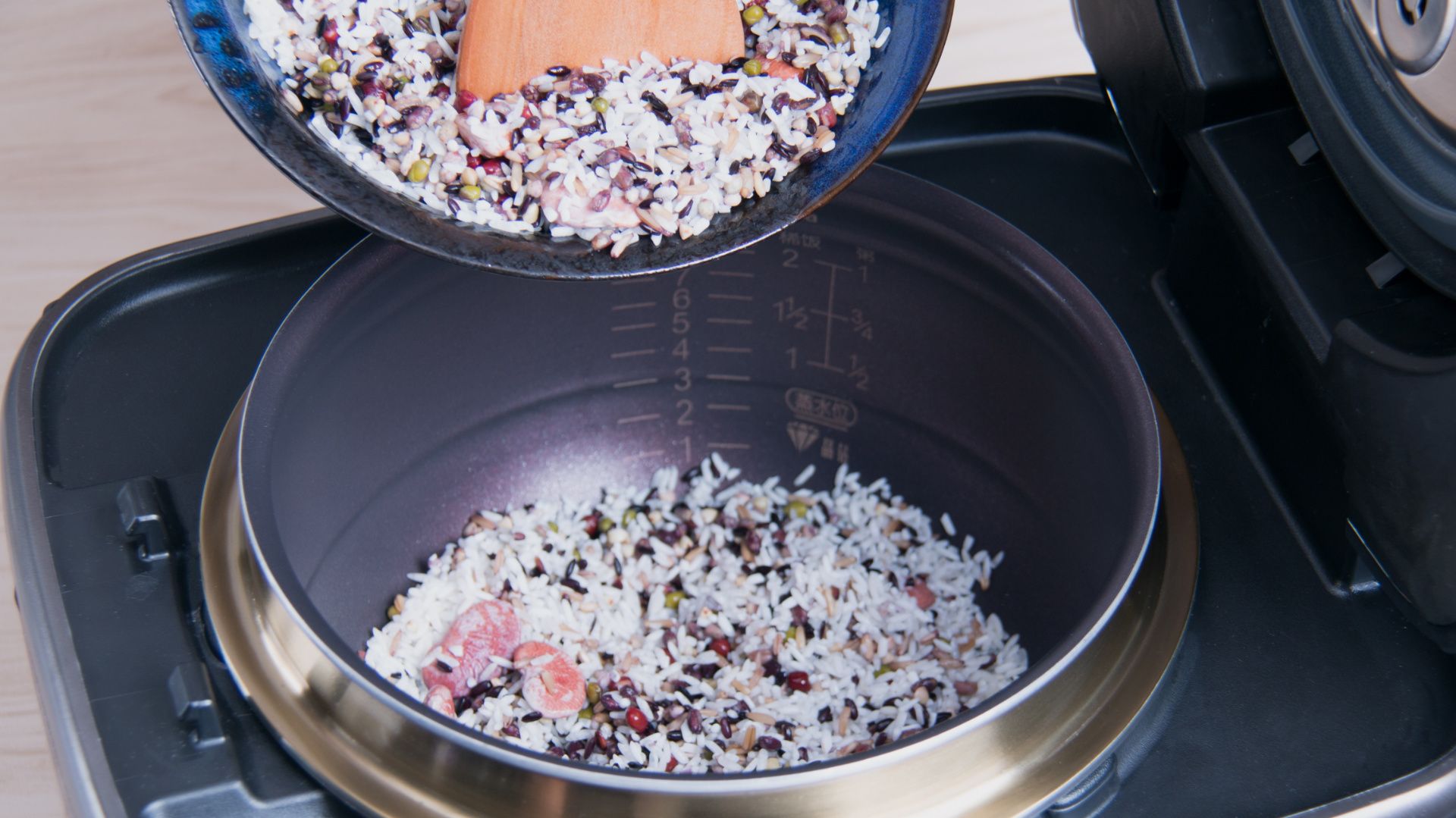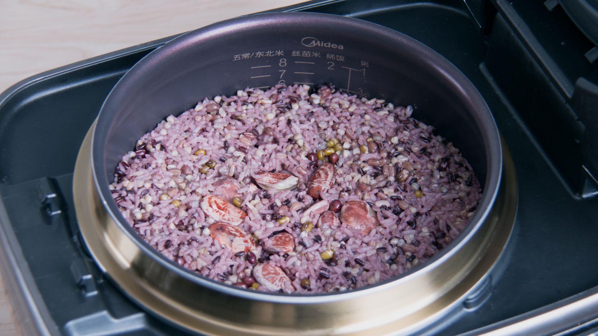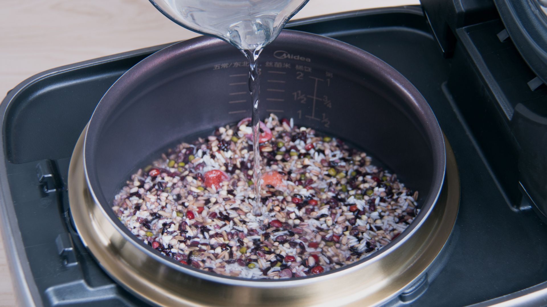 浸泡完成后加入大米、糙米、黑米、荞麦淘洗干净放入内胆。