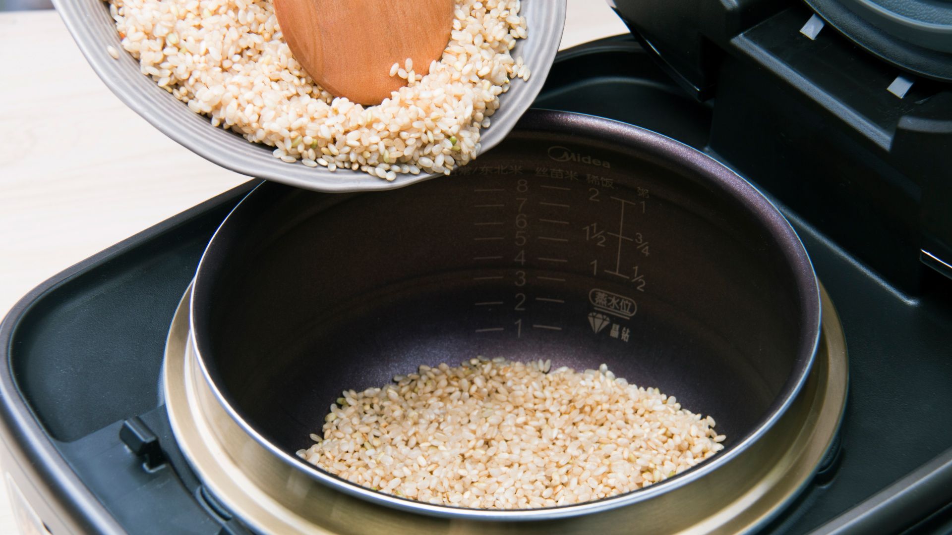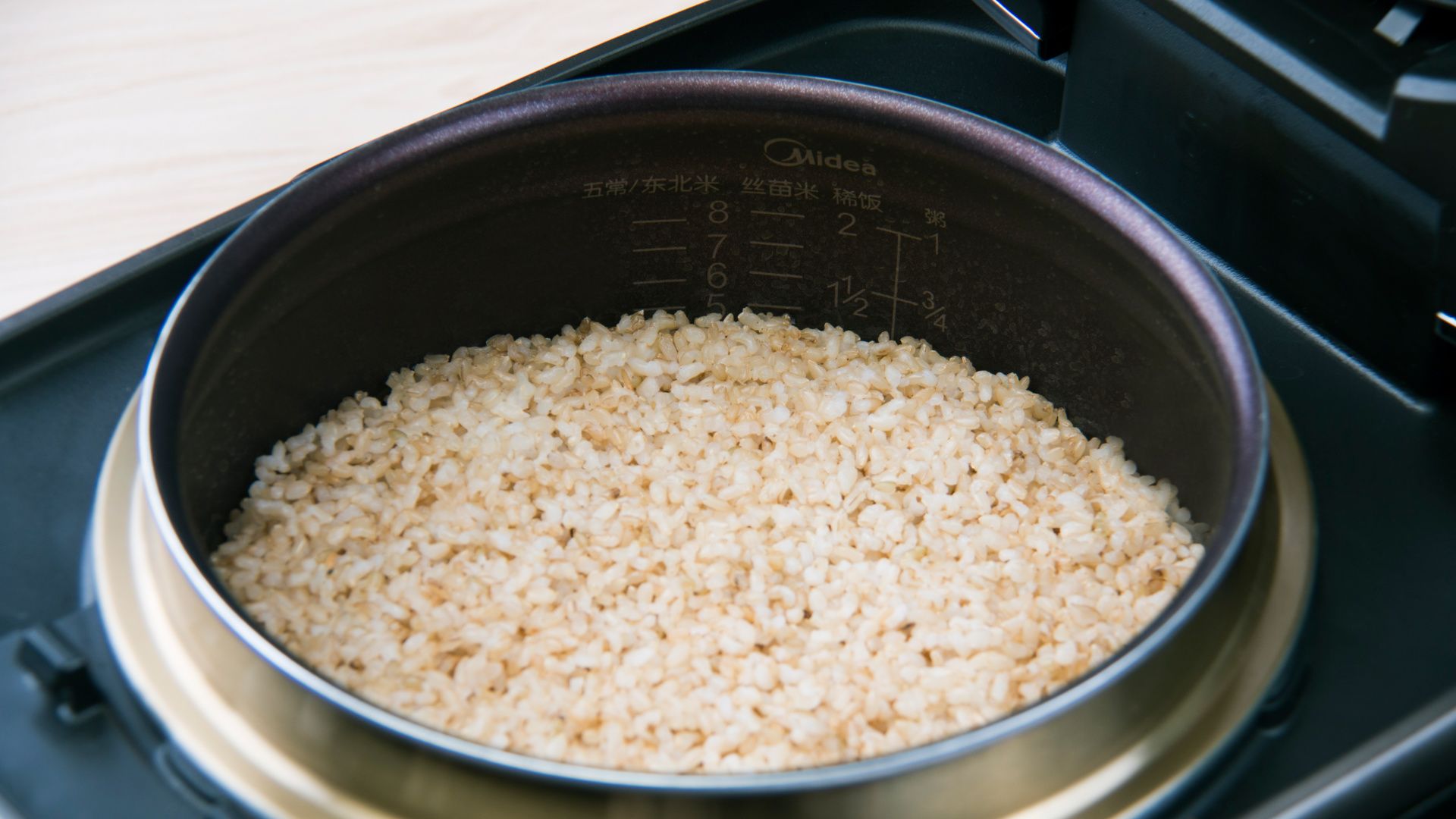 将发芽玄米洗净(注意洗米是不要用力过度,以免造成胚芽等营养成分流失)建议多洗几遍,因为发芽过程中会产生一些酸味或别的味道,洗好的大米放入内胆。