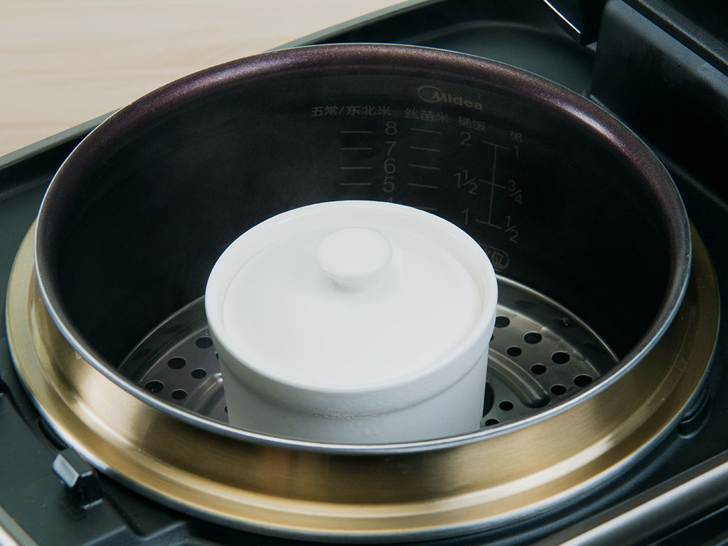 内锅放上蒸笼、摆入搅拌好的鸡蛋,按下煮饭键,有蒸锅的朋友请直接使用效果更好,大火烧开,中小火15分钟然后着火焖10分钟即可。
