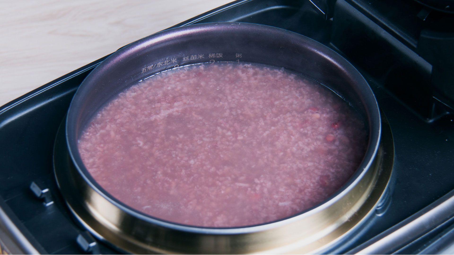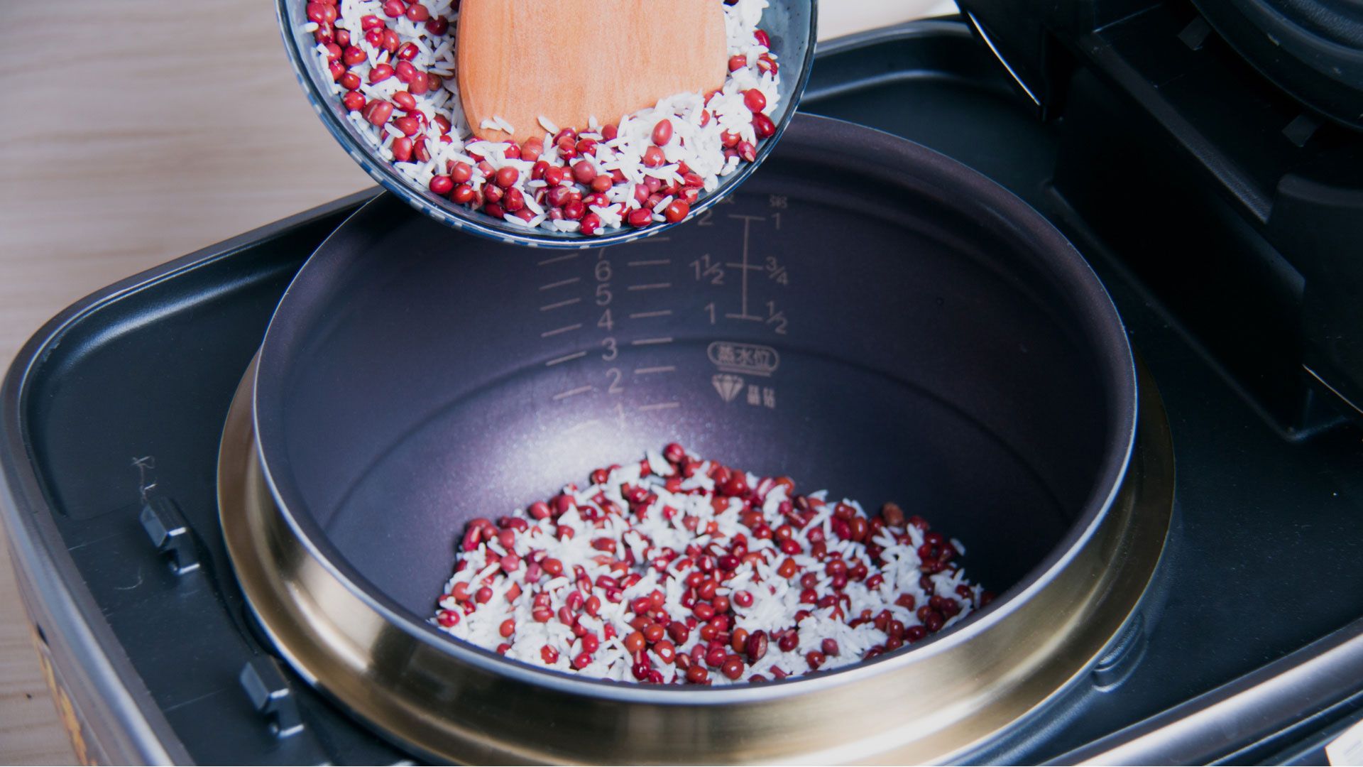 大米洗净沥干,泡好的红豆、冰糖一同倒入内锅。