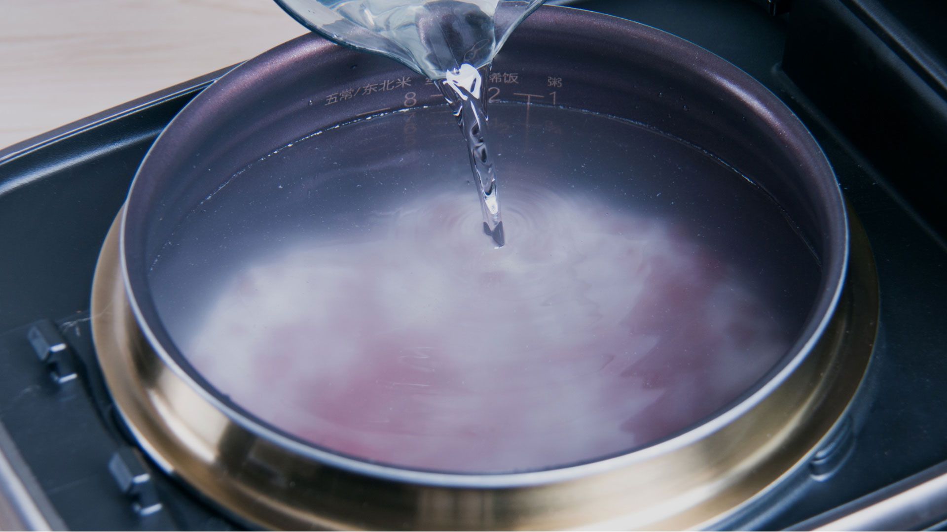 注入清水至煮稀饭2刻度水位。合盖开始烹饪。