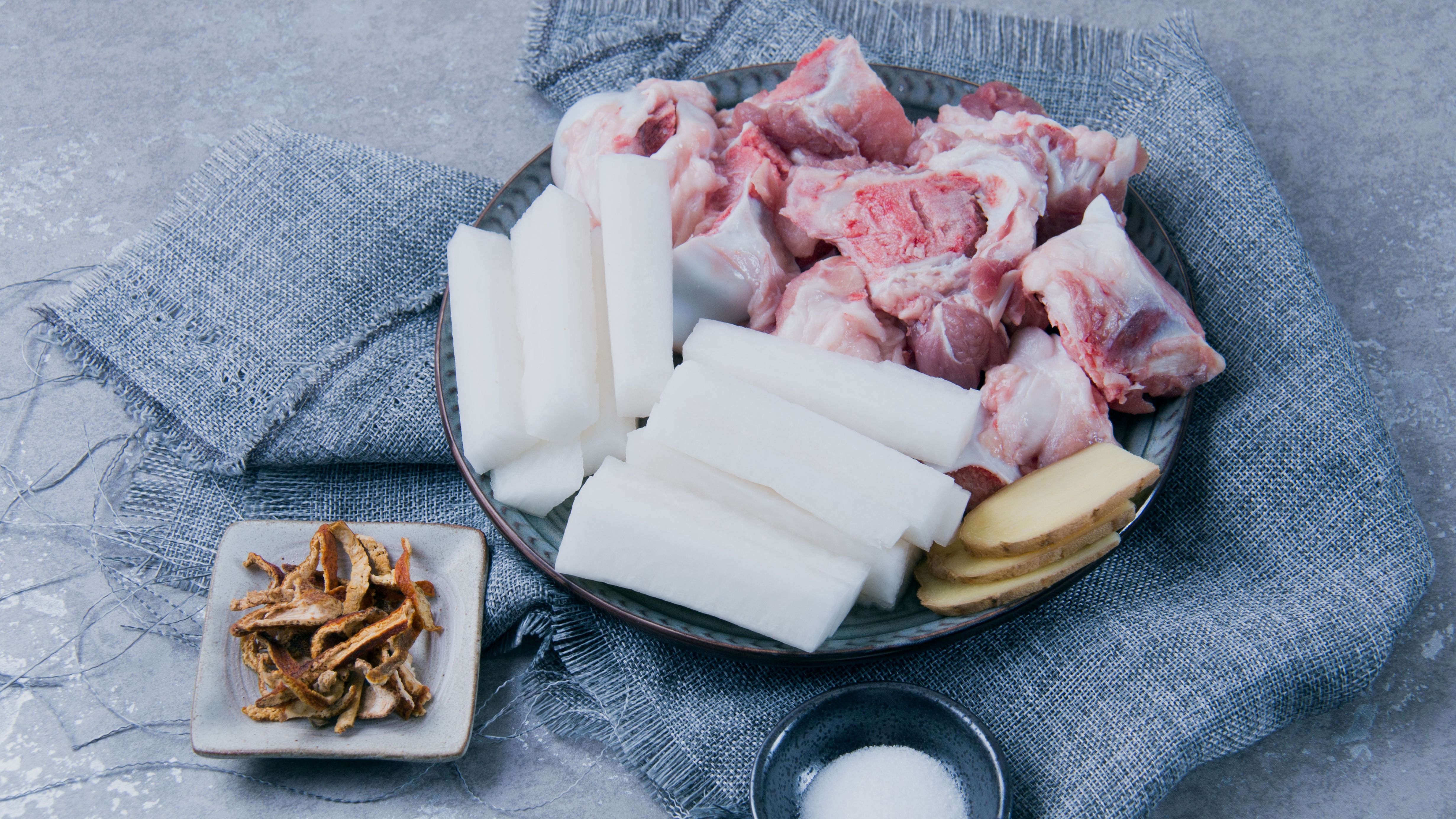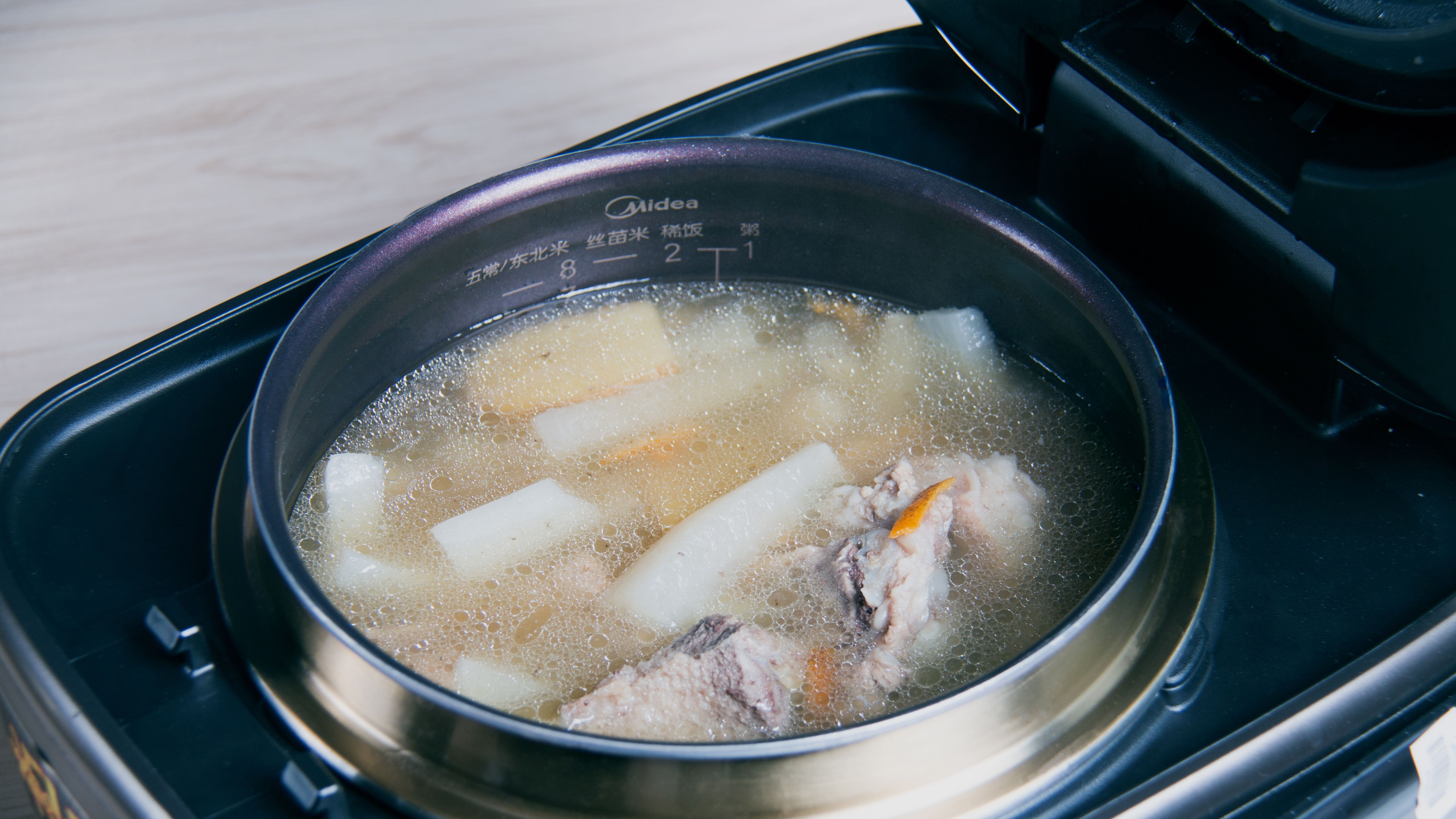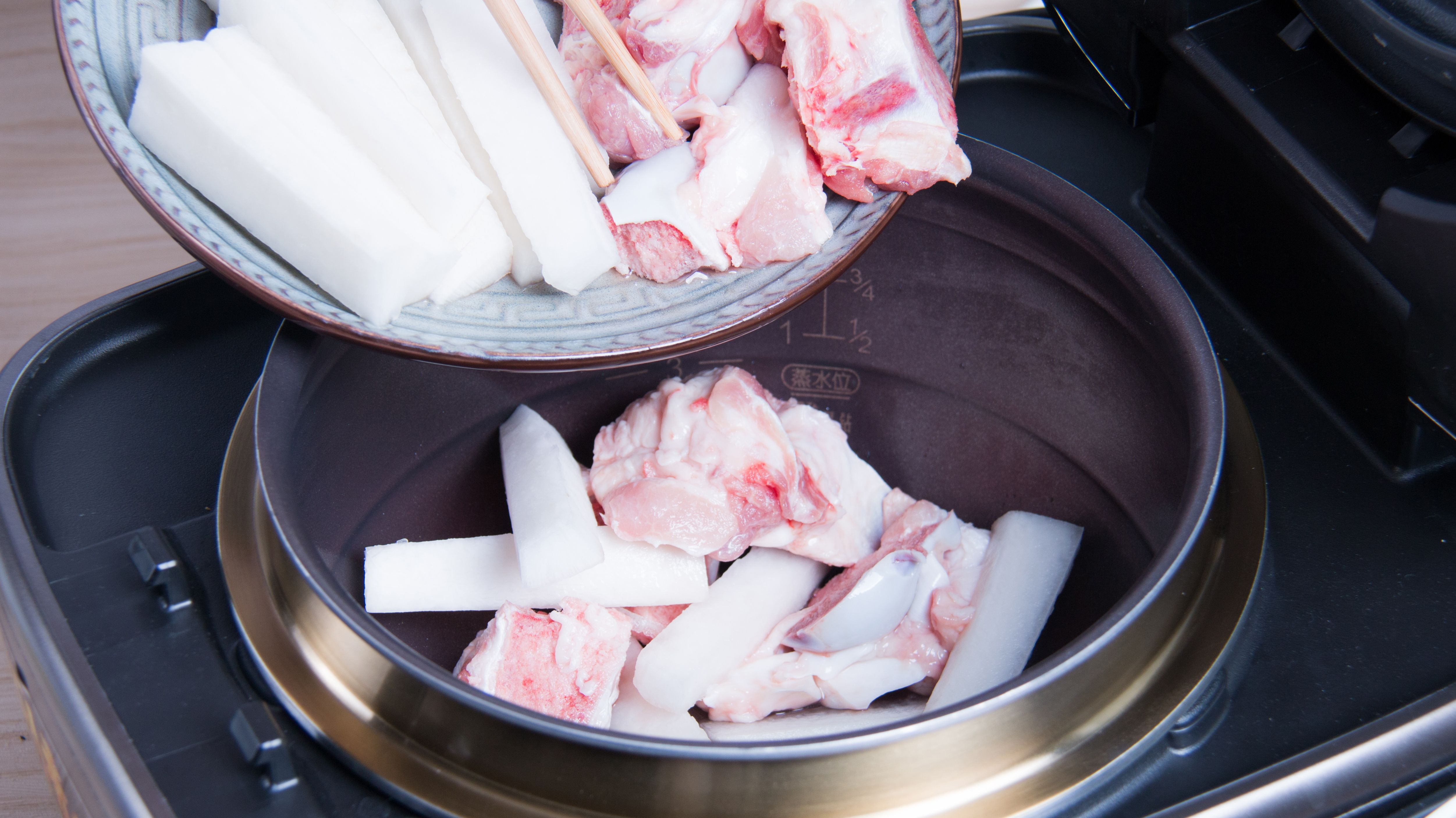 如果是砂锅可以多放一点水,盖上盖子, 开大火煲开,转为小火。白萝卜可以在1小时后再放进去也行,去皮洗净,切成大块。起锅前加入适量的盐调味即可。