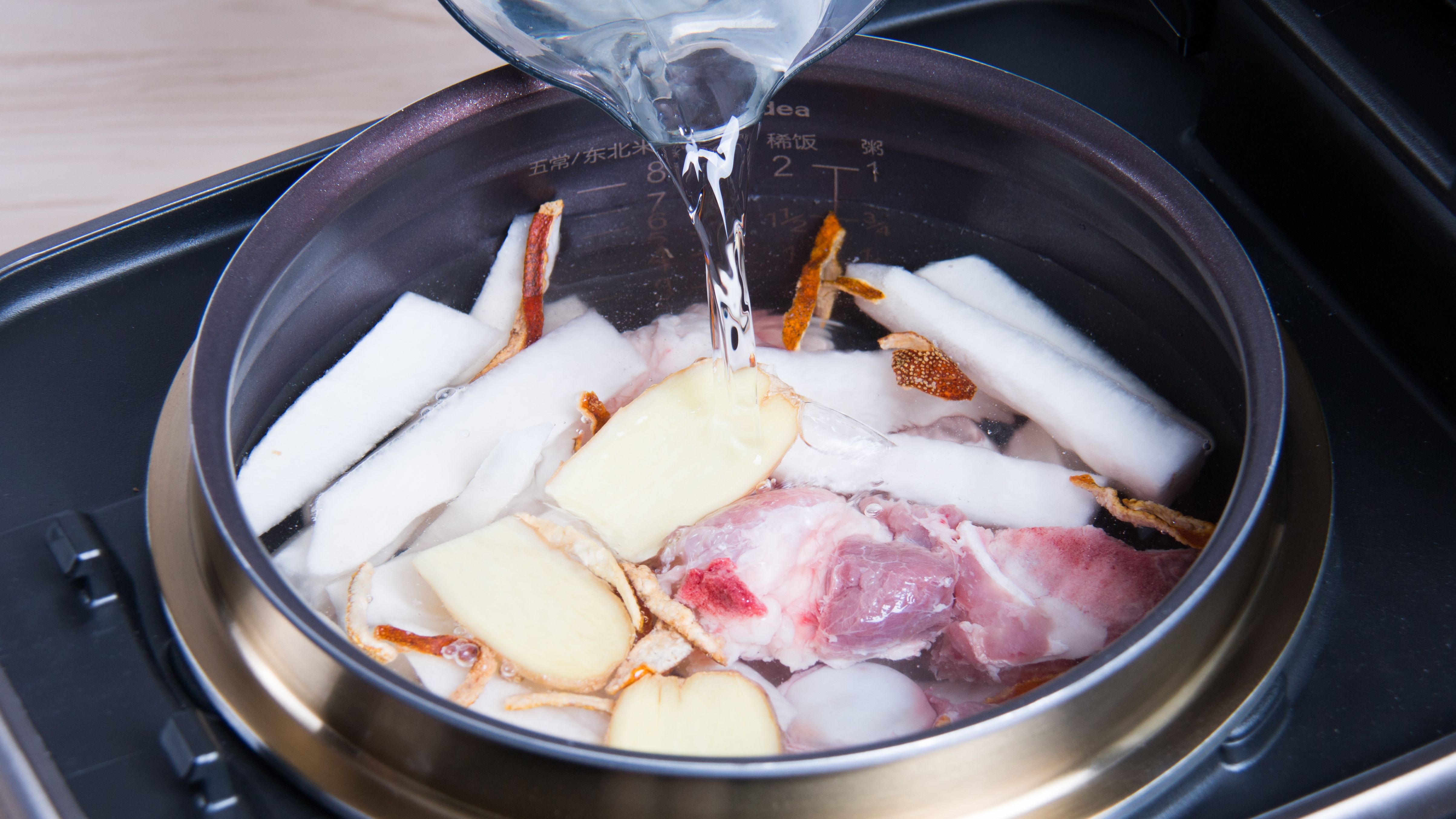 将猪骨放入瓦煲中或者电饭锅或者砂锅都可以,砂锅小火慢炖最最香。加入清水至稀饭2刻度水位,合盖开始烹饪。