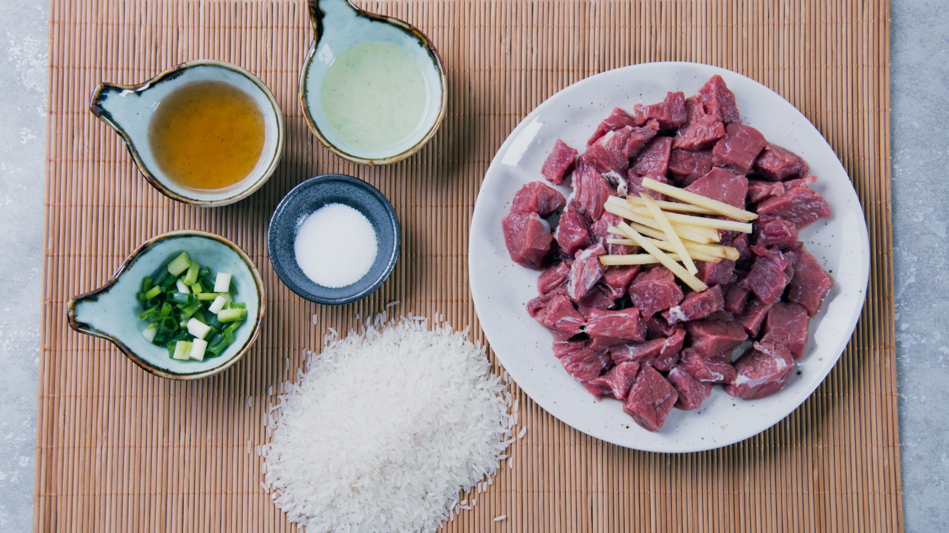 准备好食材,牛肉洗净切丁、姜切丝、葱切段待用。