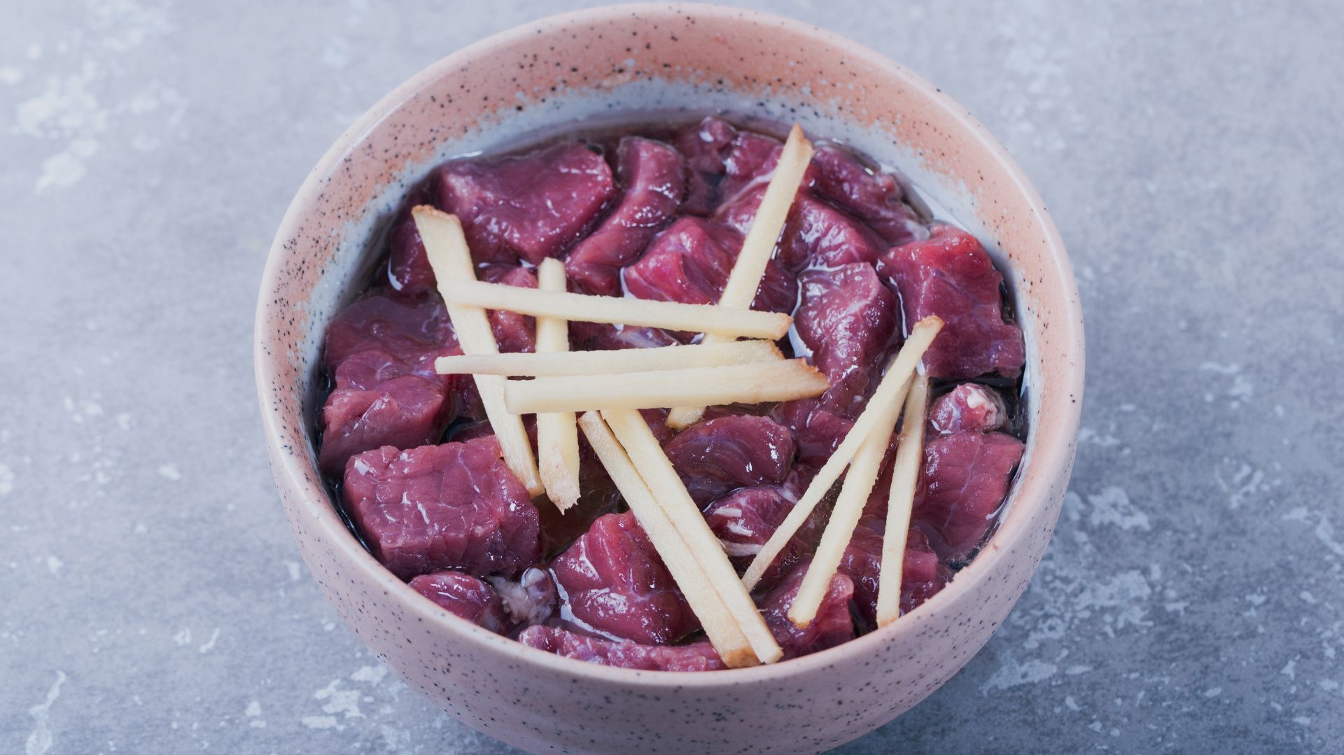牛肉装入容器加入油、料酒、姜、盐搅匀腌制。