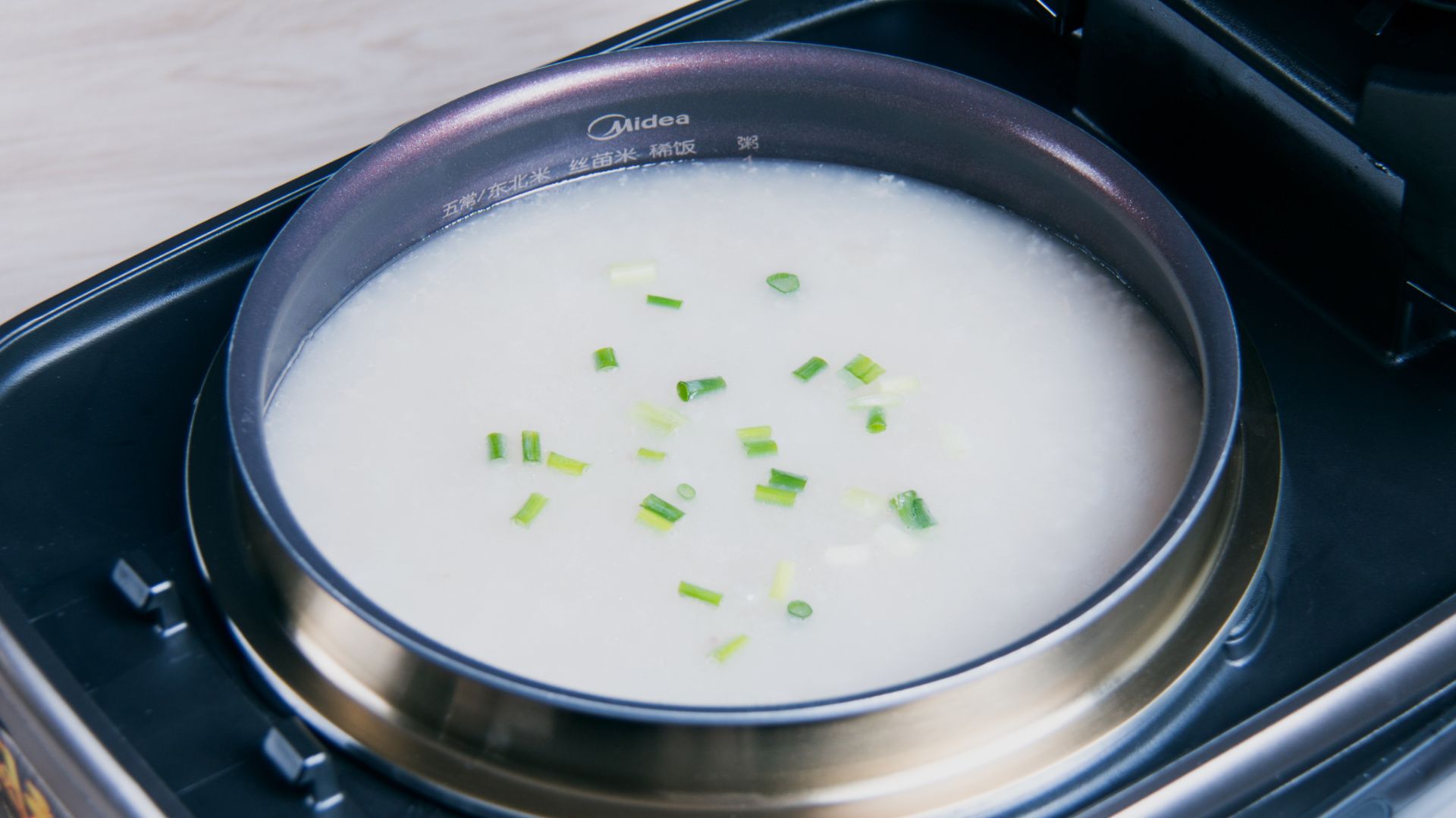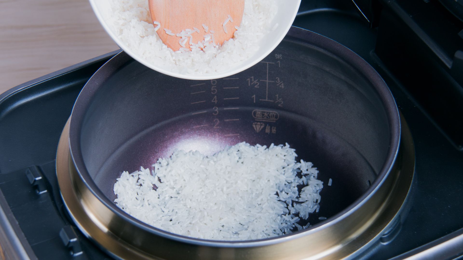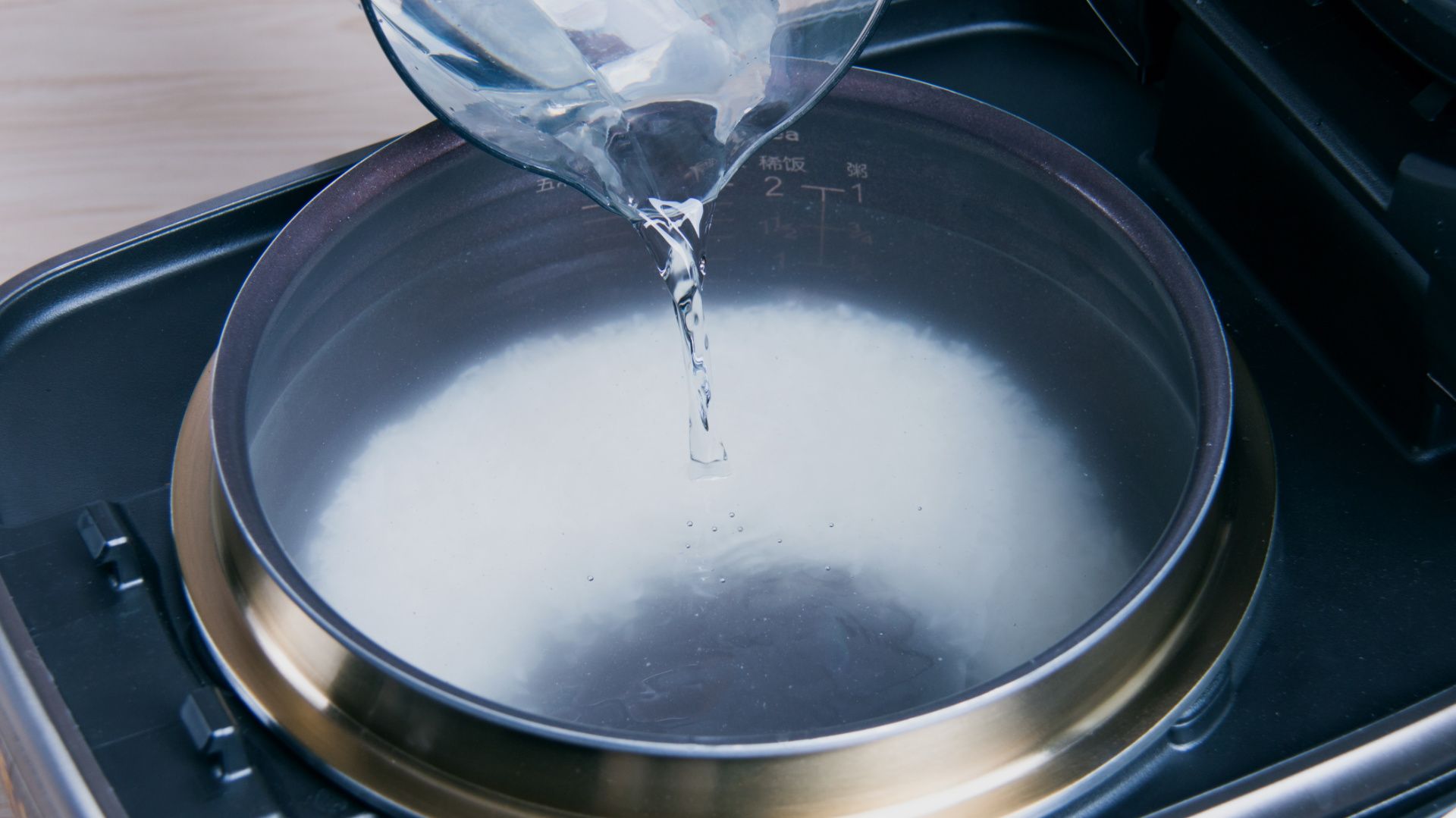 加水至稀饭2刻度水位、合盖开始烹饪。