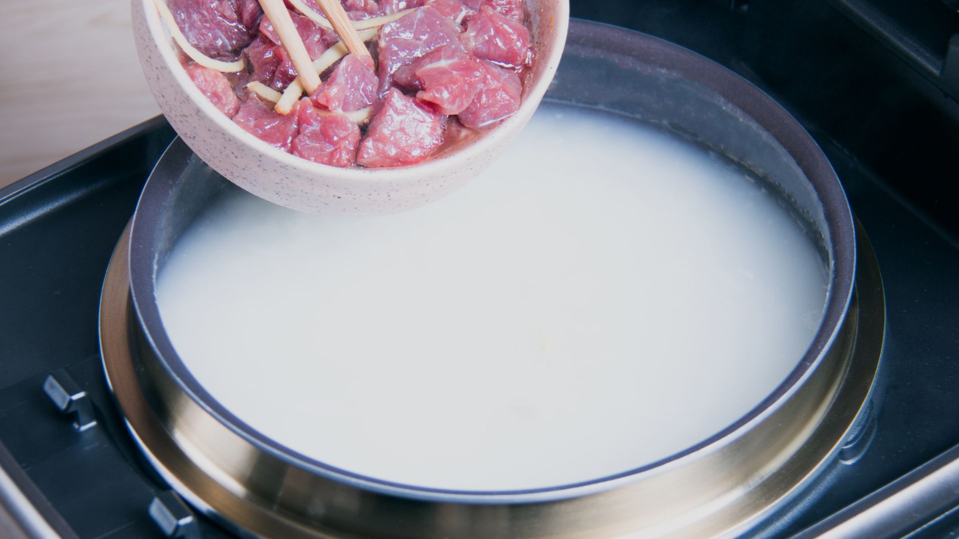待饭煲熬粥至1小时30分后开盖放入腌好的牛肉搅匀,合盖继续煮食。