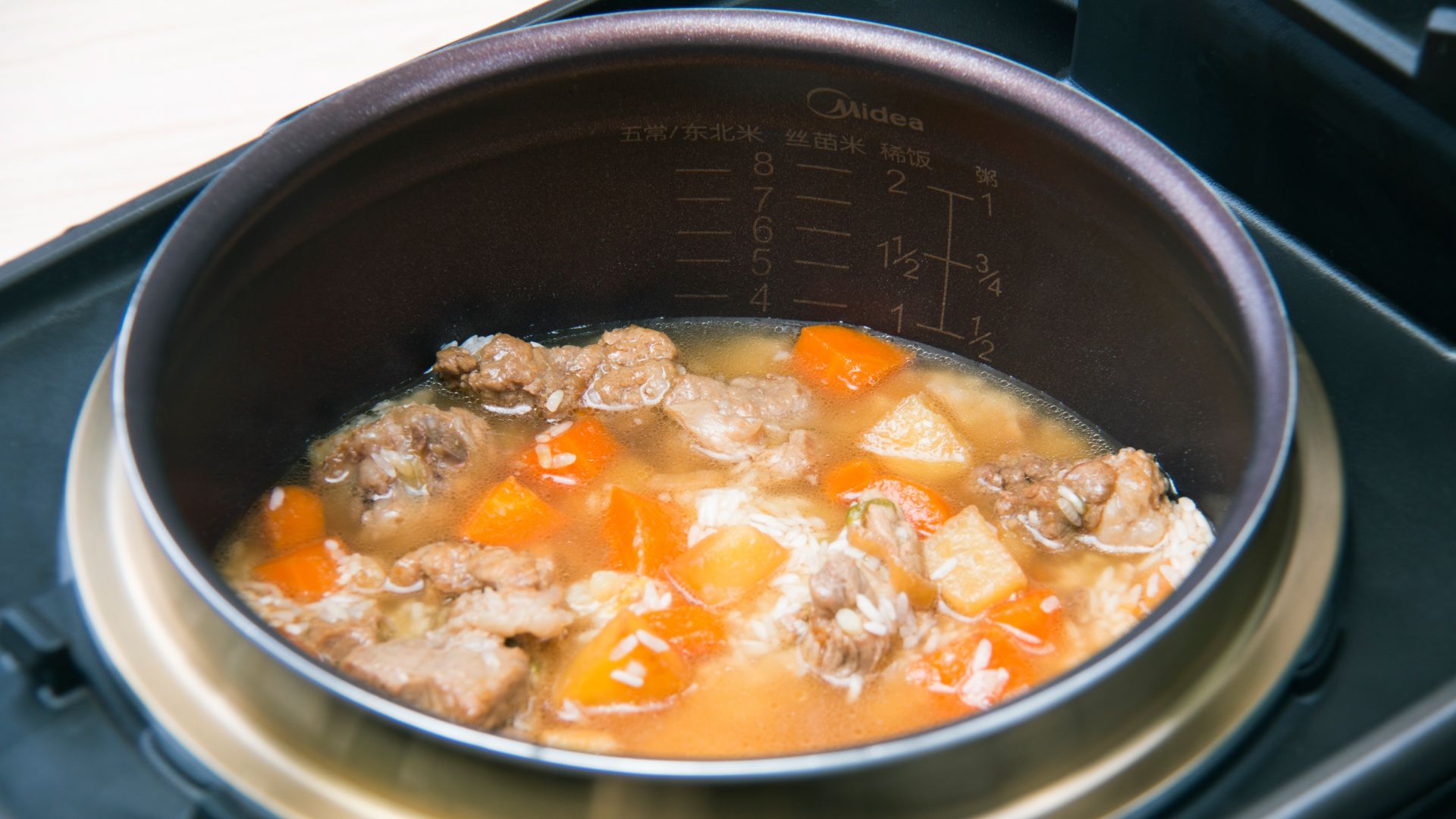 大米洗净后放入锅中,注入清水至煮饭3刻度水位,再加入炒好的排骨。