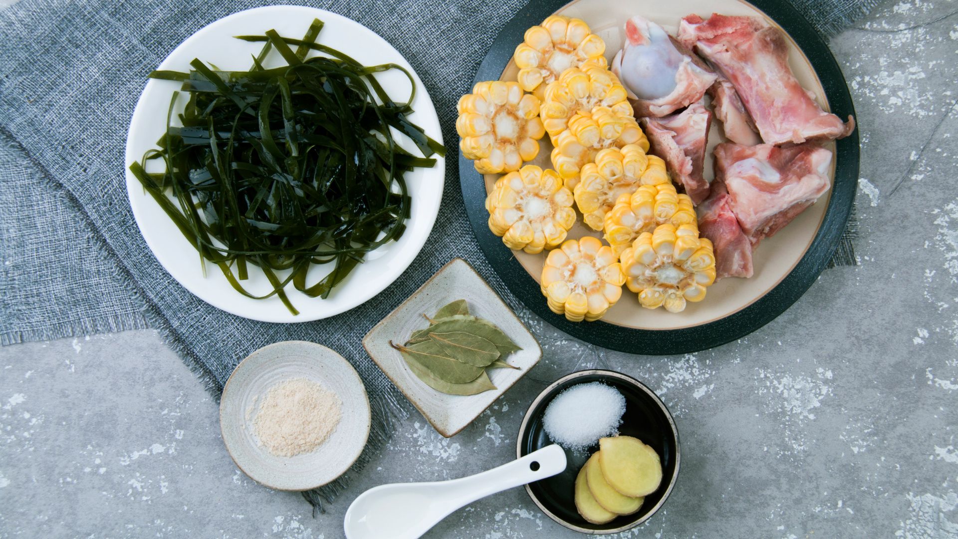 准备好食材,大骨焯烫去污洗净,玉米切块,海带切丝,姜切片待用。