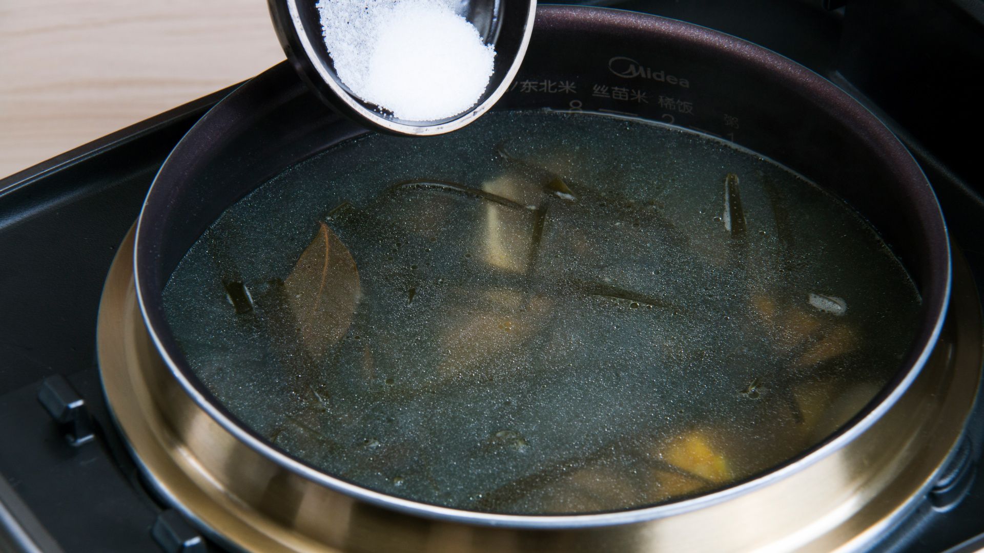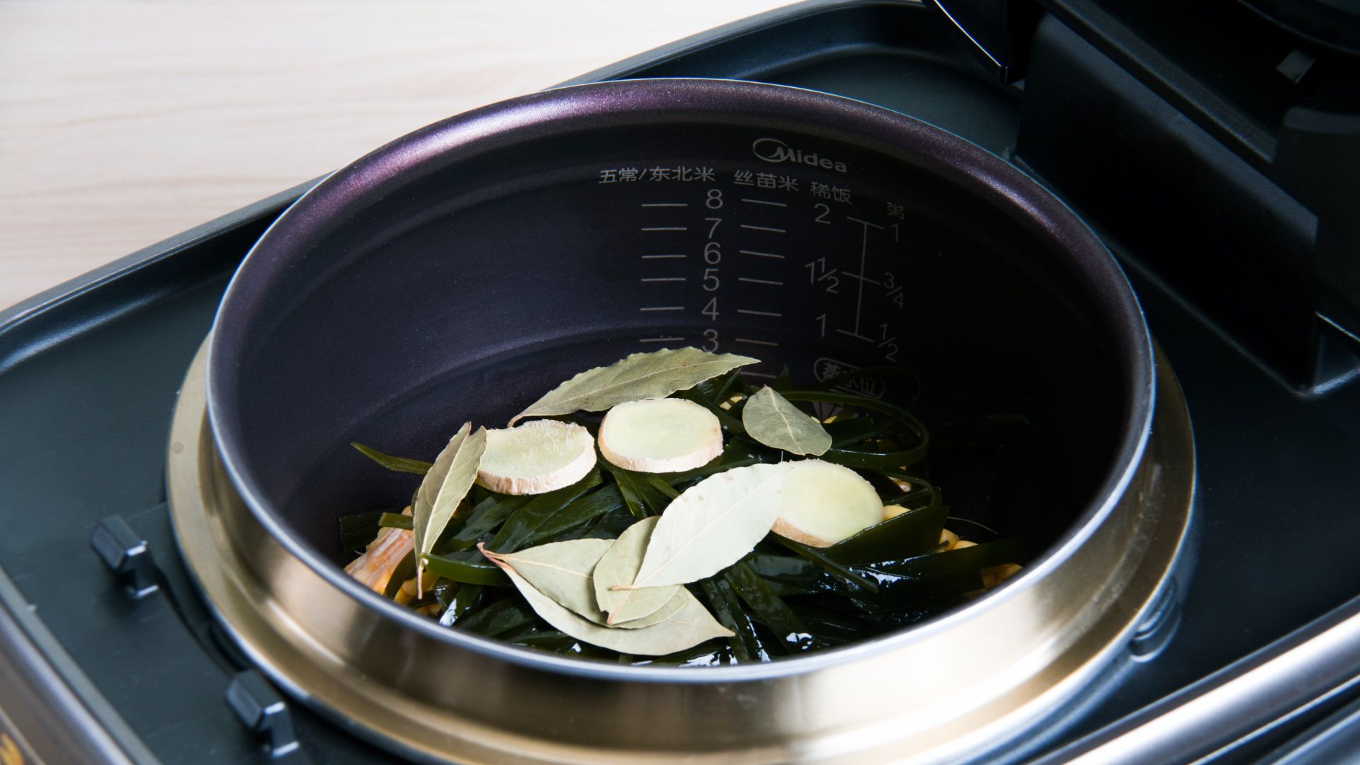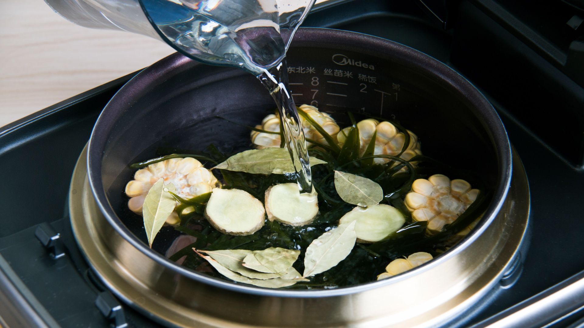 将大骨、玉米、海带、姜、香叶一同倒入饭煲内锅。