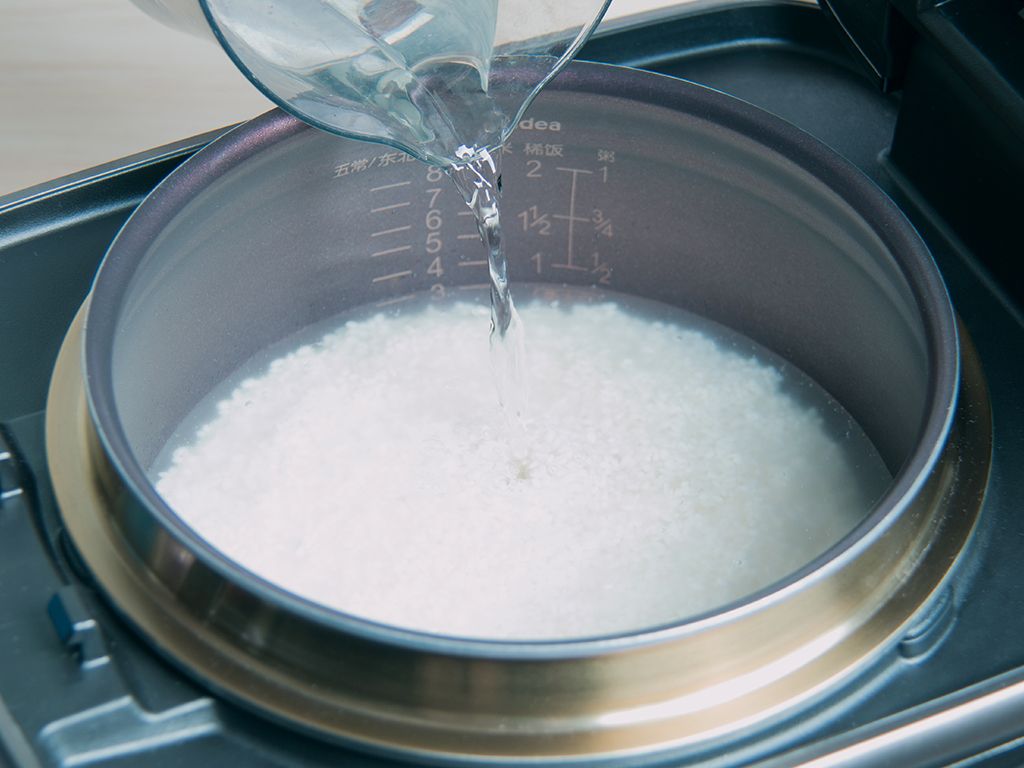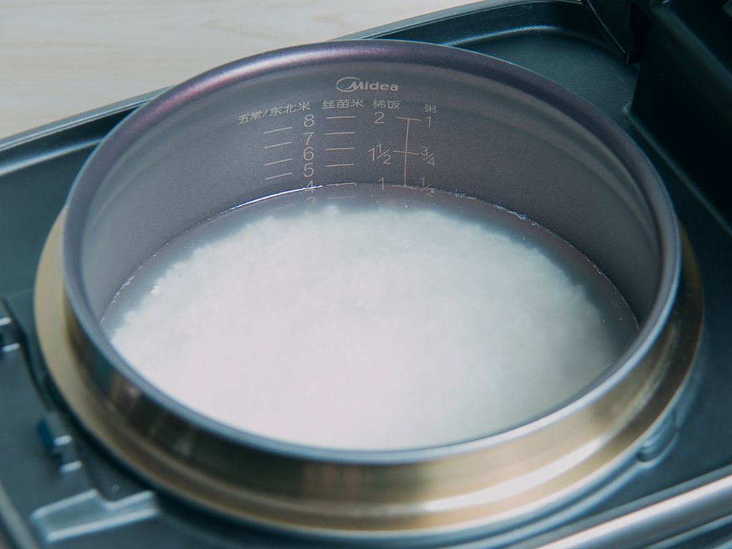 将大米量入容器,反复淘洗干净沥干。(可按人数增减重量)。