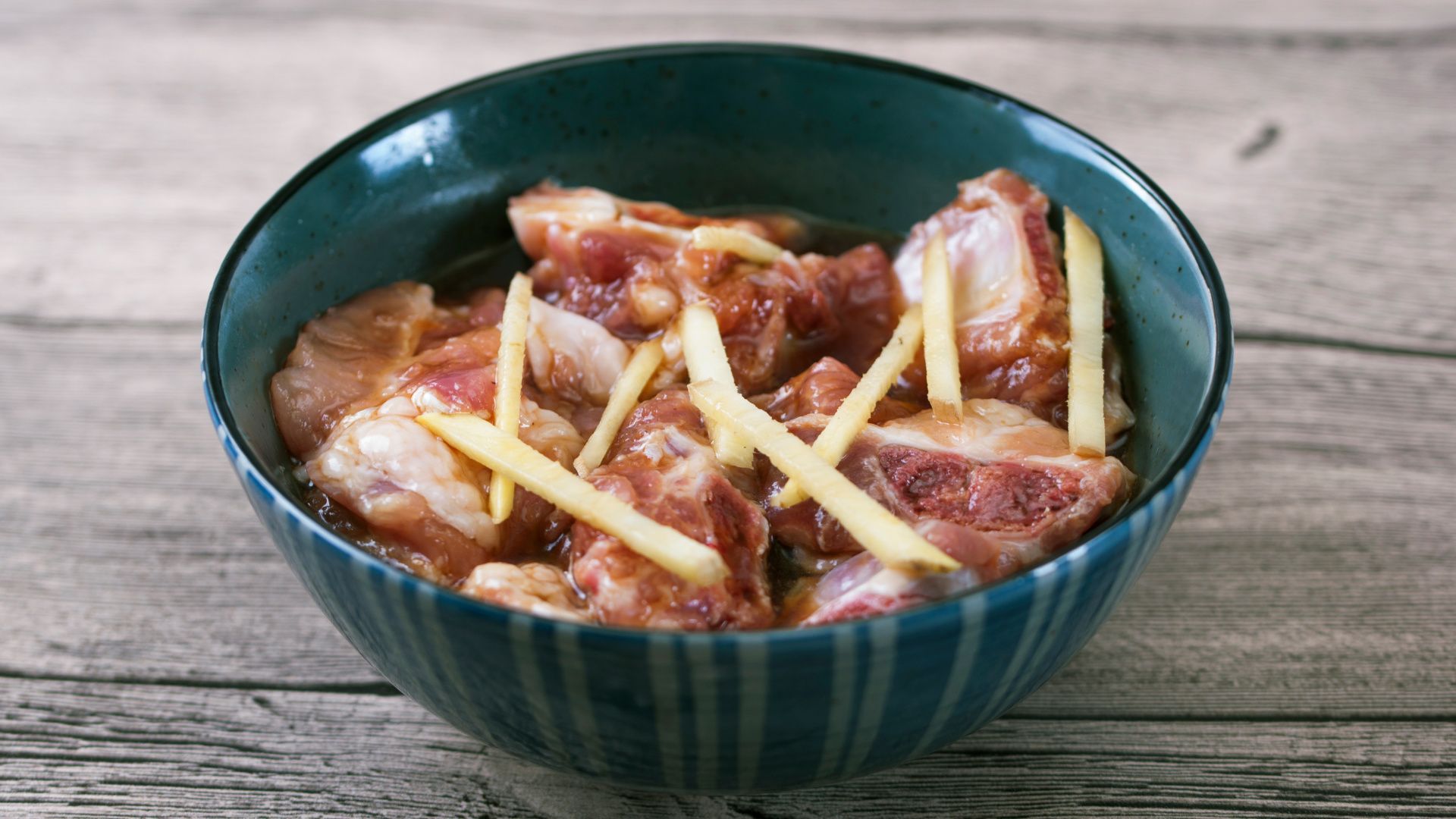 排骨飞水、沥干倒入容器,加入生抽、白糖、料酒、耗油、姜、盐搅匀腌20分钟后摆入盘中。