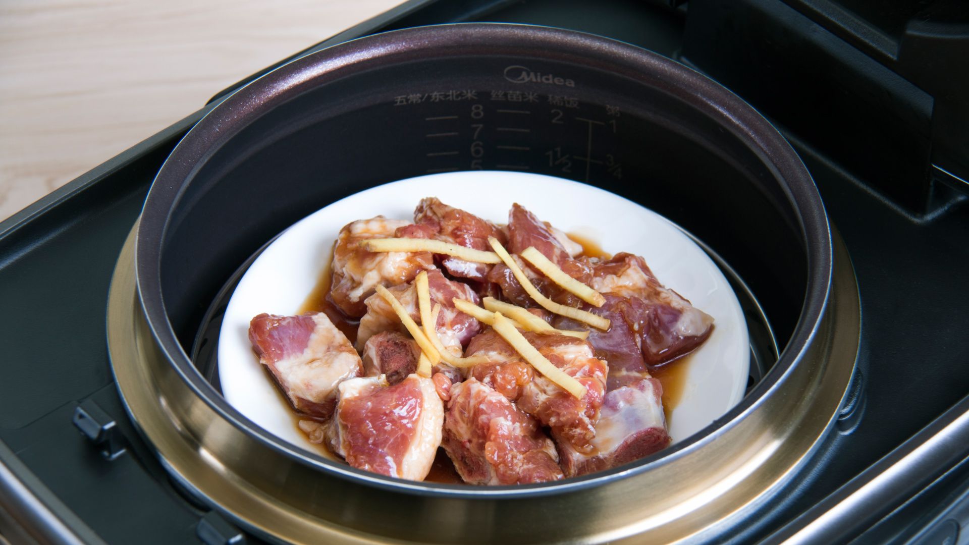 内锅放上蒸笼、摆入弄好的排骨。合盖开始烹饪。
