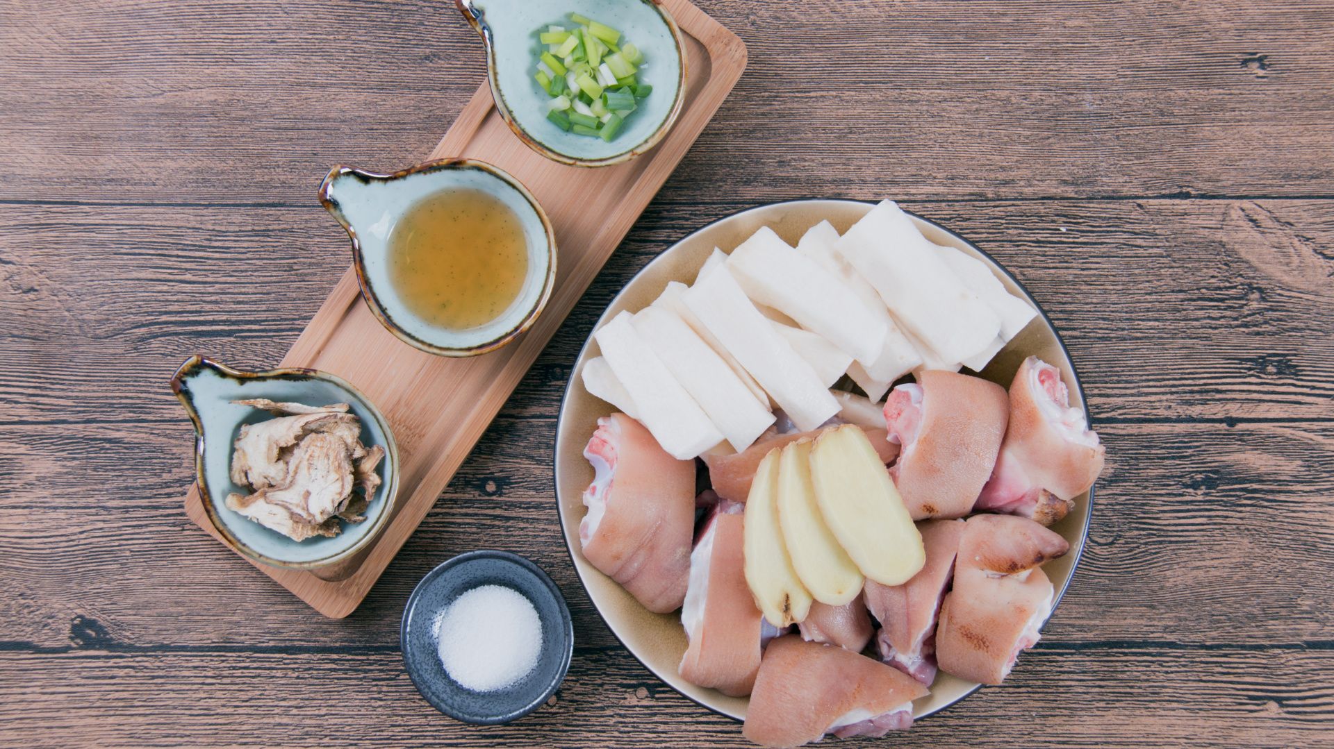准备好食材。猪蹄洗净剁碎、淮山切块、姜切片、葱切末。