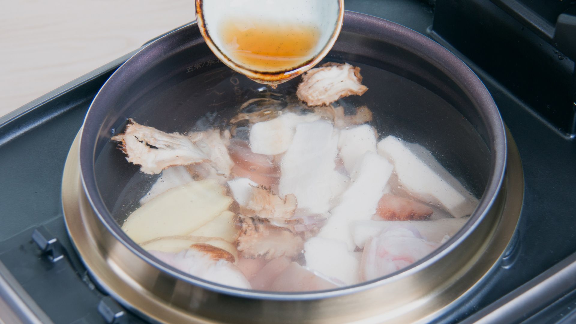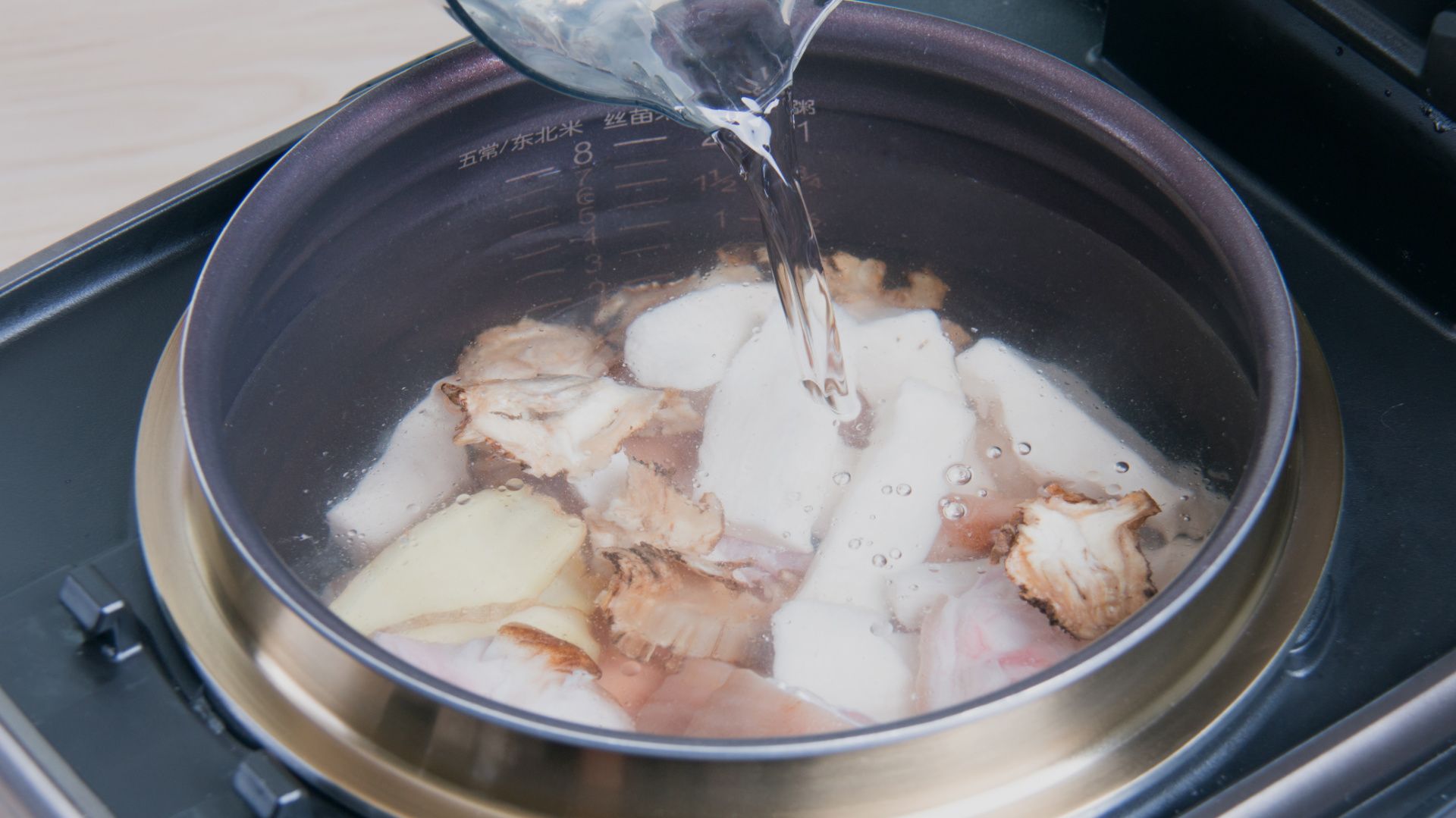 猪蹄过水沥干倒入内锅,加入淮山、姜,注入清水。