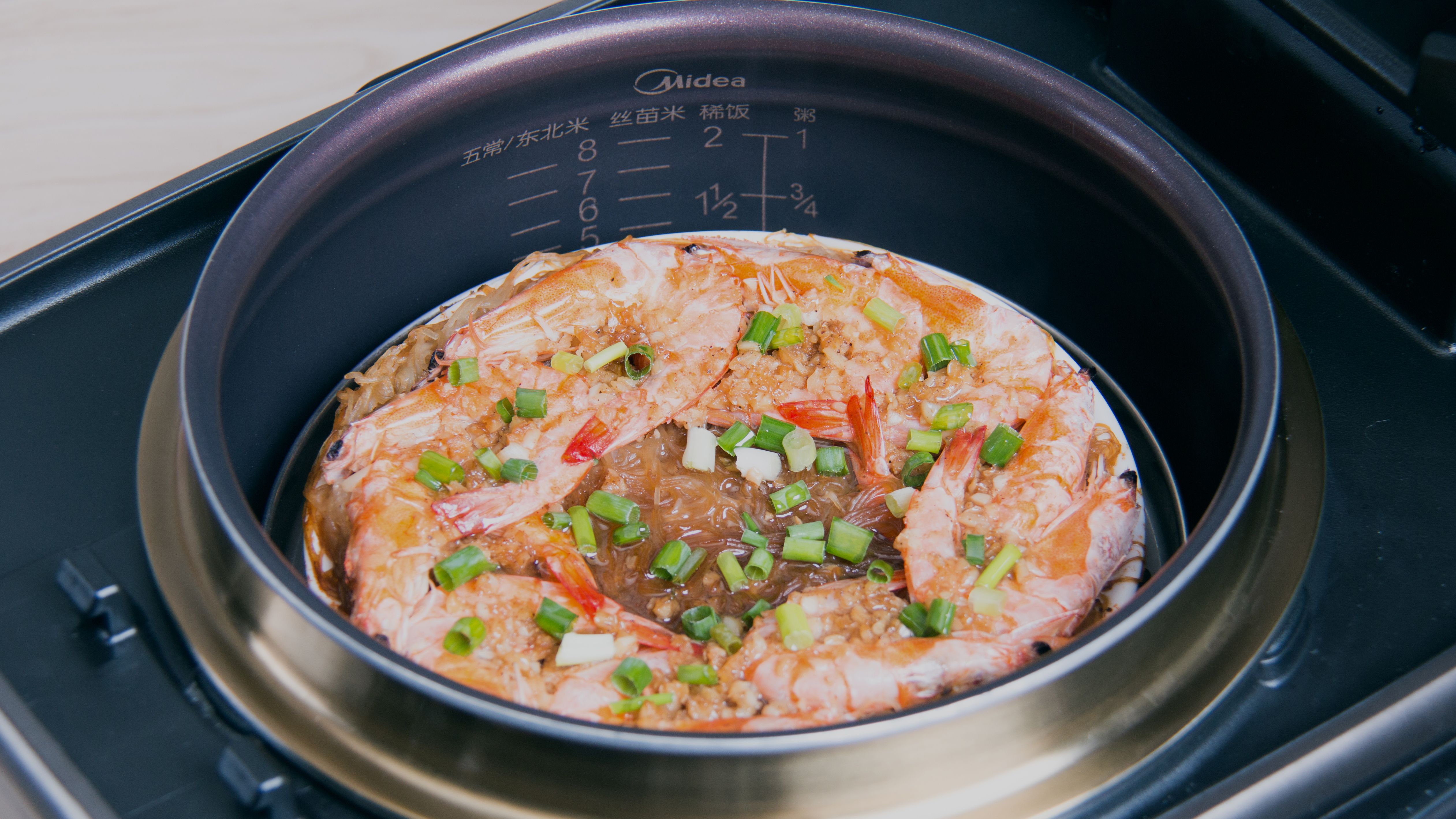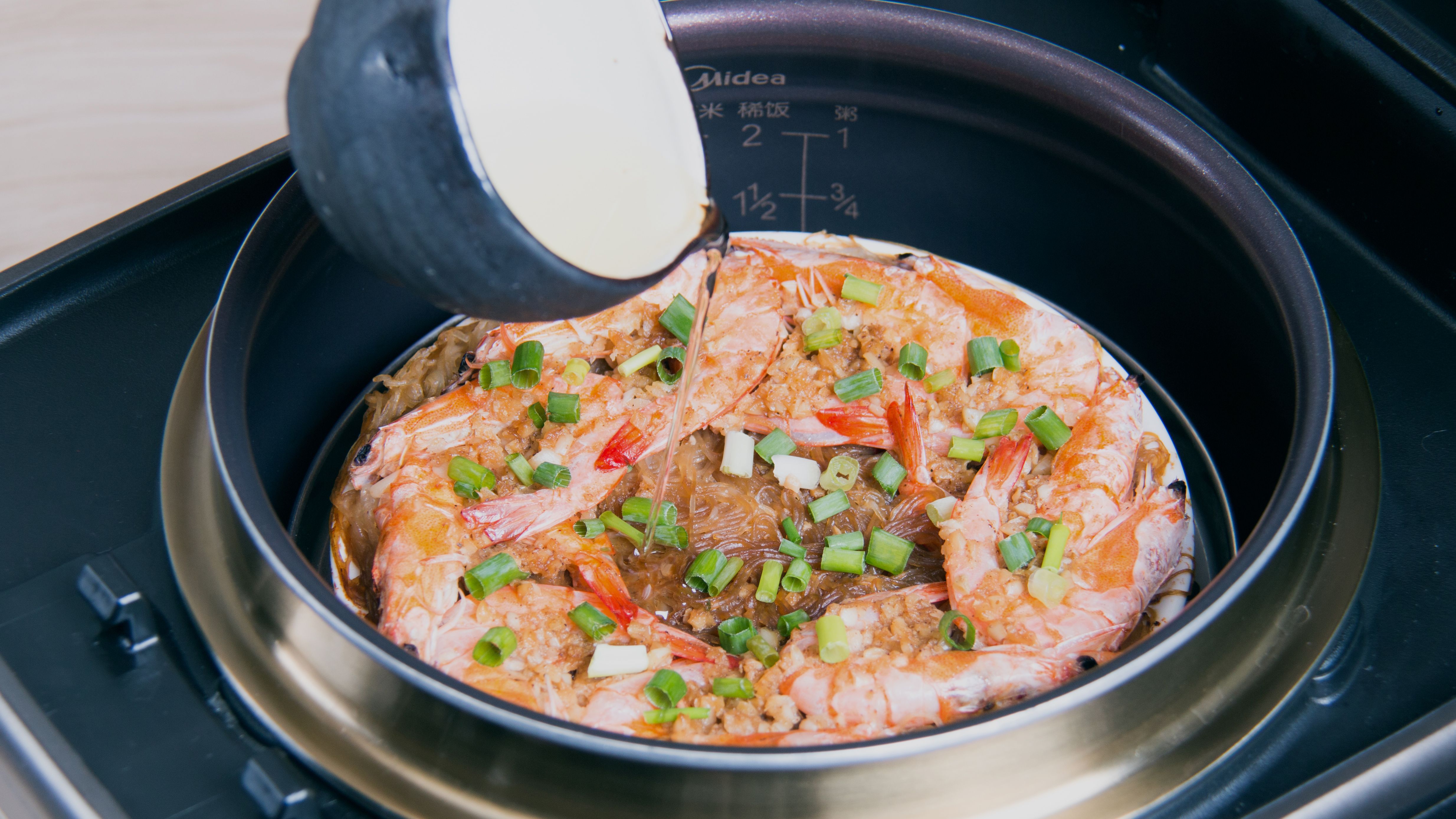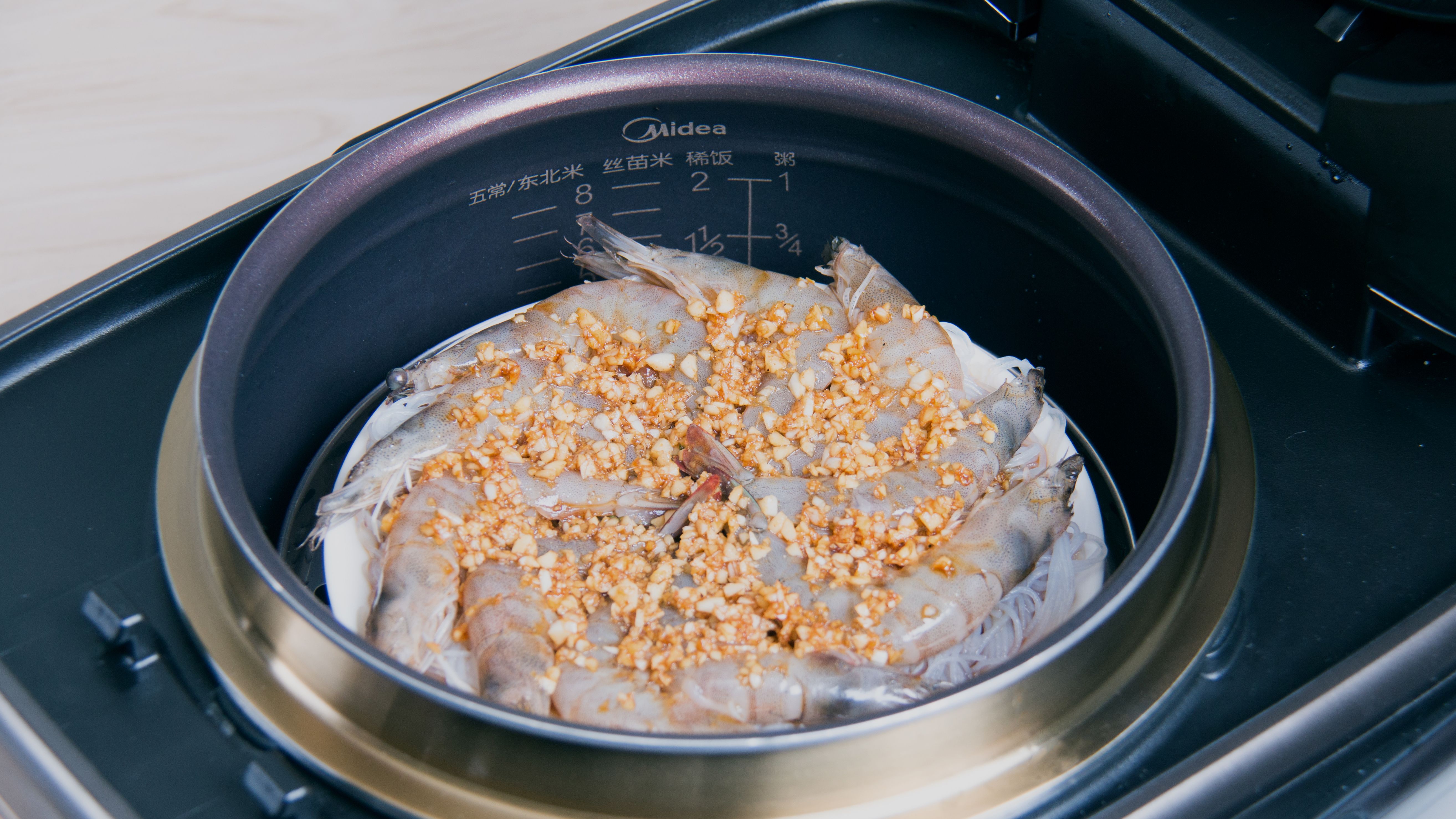 饭煲内胆加水至煮饭3刻度水位放上蒸笼,摆入装好的虾。