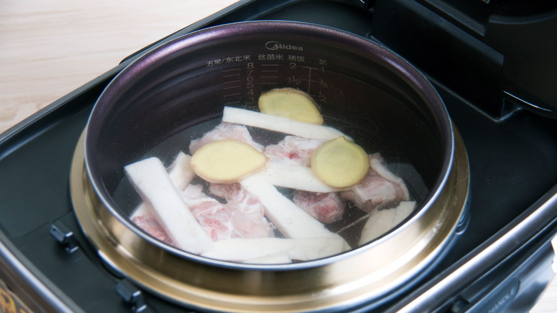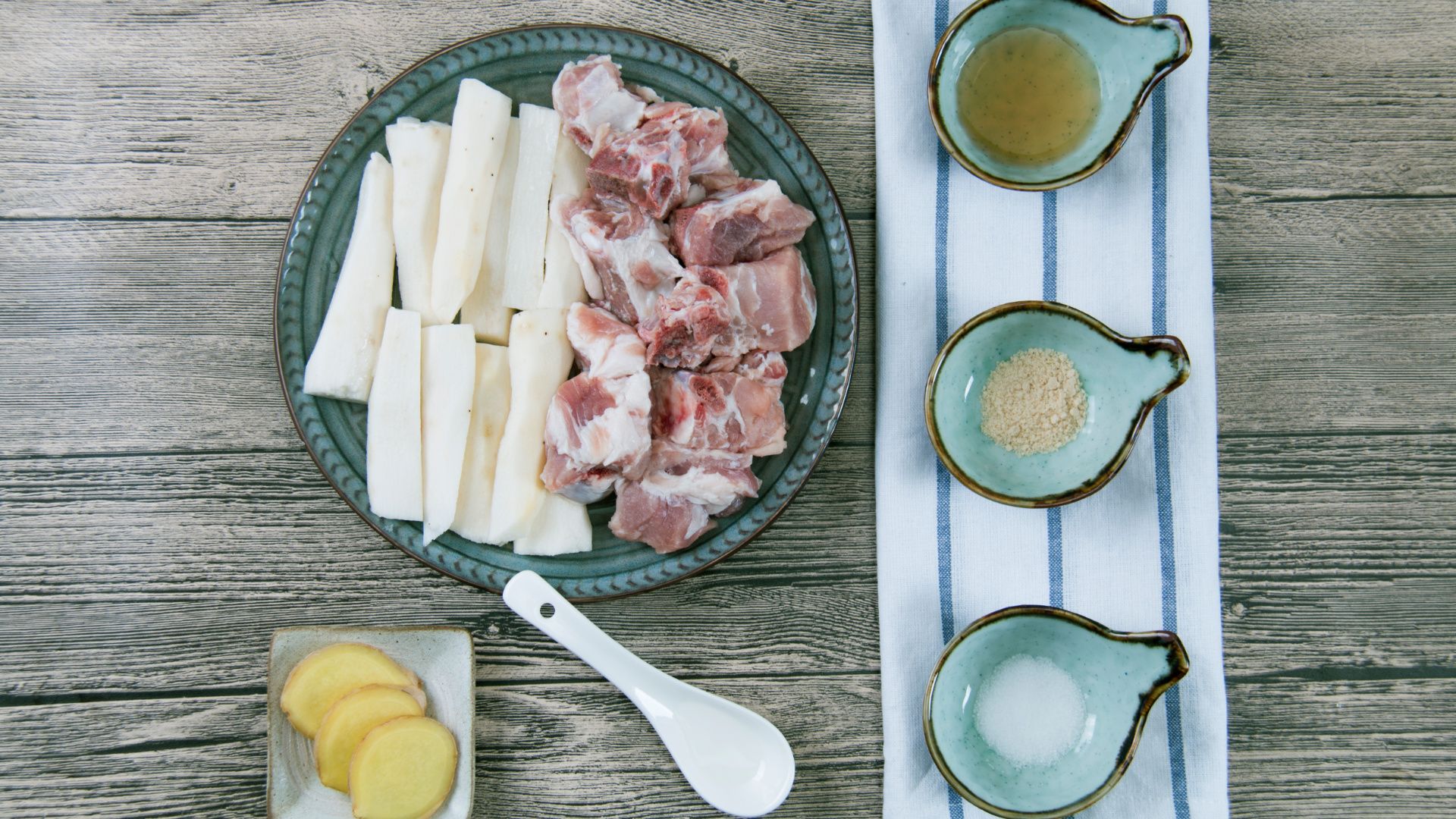 准备上面清单的相关食材,将排骨剁开放入凉水烧开后焯一下,用热水洗净。山药切块、姜切片辅料待用。