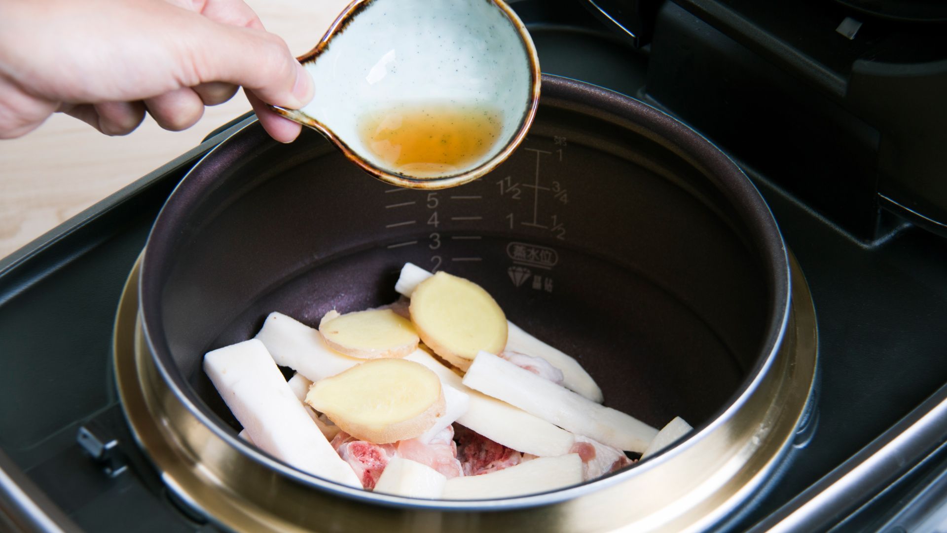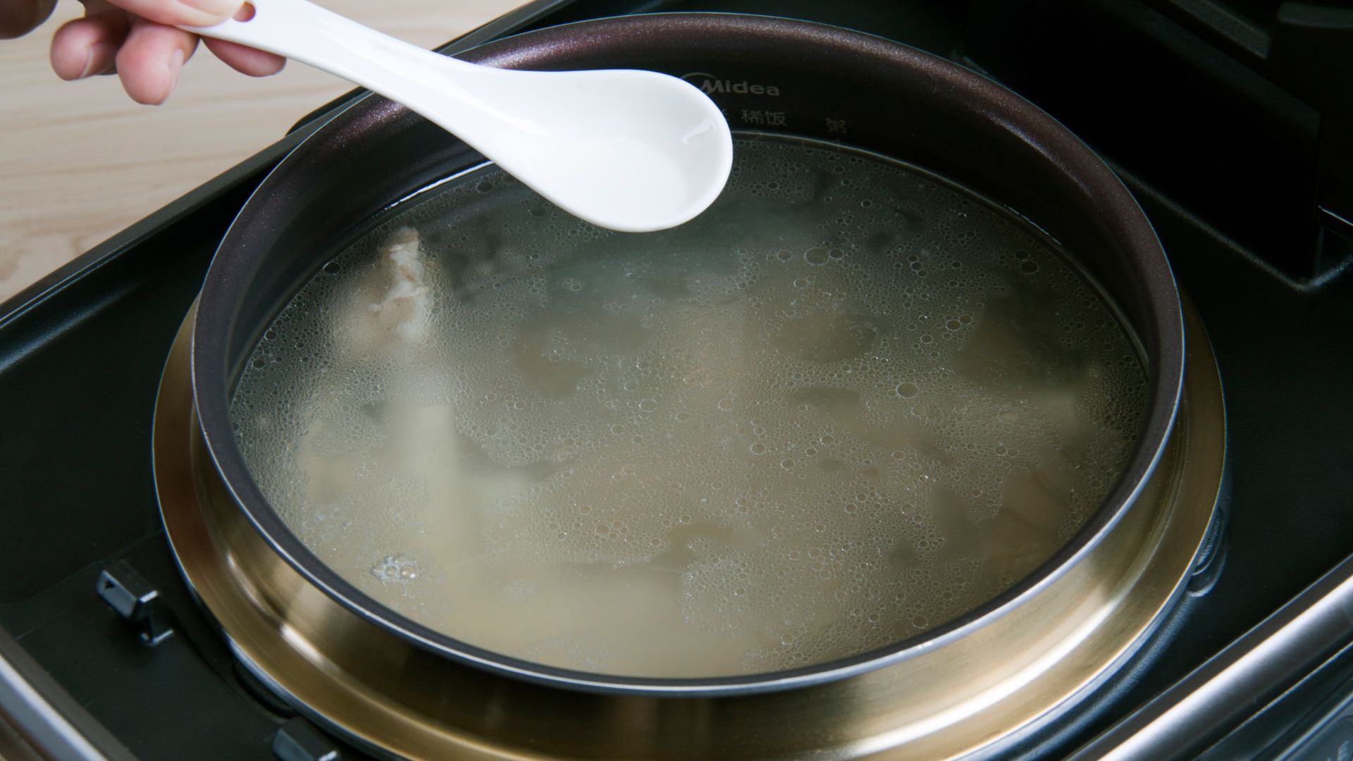再注入清水至稀饭2刻度水位。合盖开始烹饪2小时