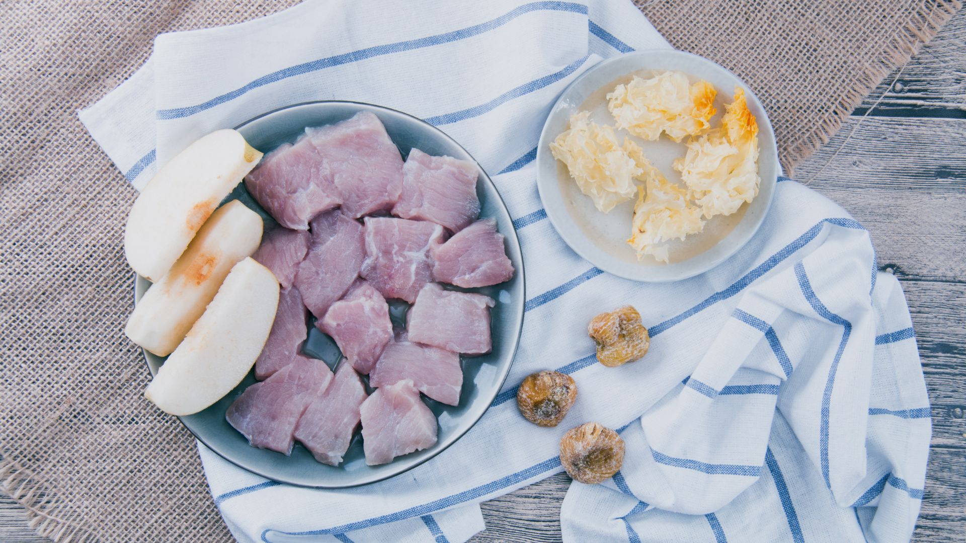 准备好所有材料。雪耳用开水浸泡松软去头杂质。洗干净后,撕成小朵。雪梨洗干净后去核切块,蜜枣用清水冲洗干净备用。猪肉切小块洗净焯水捞起备用。