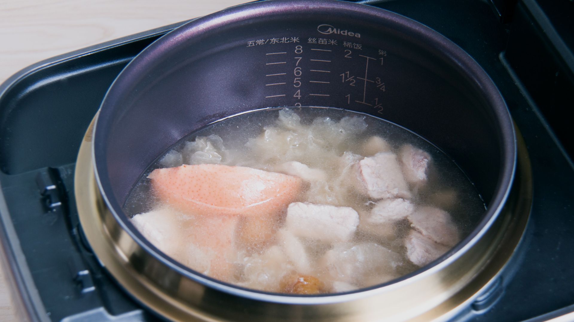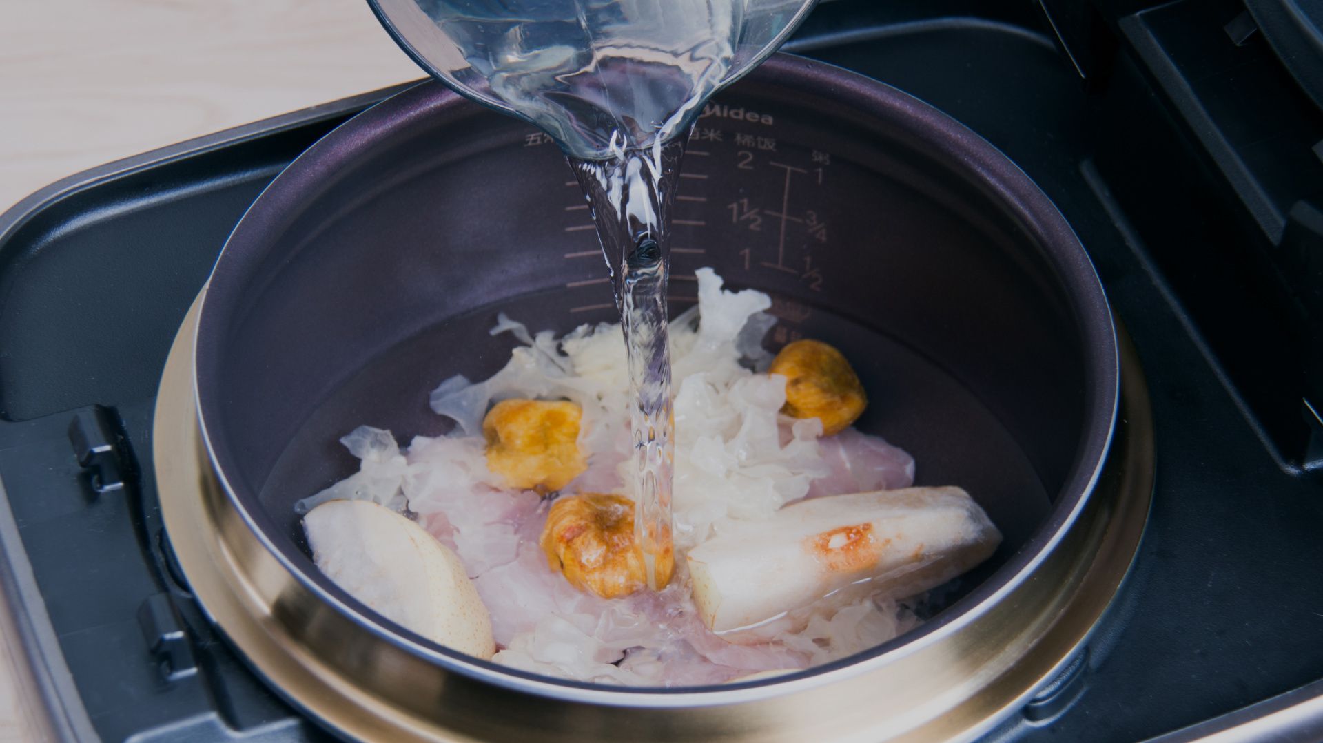 合盖开始烹饪。瘦肉、雪梨、蜜枣先煲后再加入雪耳。结束后放少许盐调味盛入碗中即可食用。(喜欢甜的可以加糖调味哦)