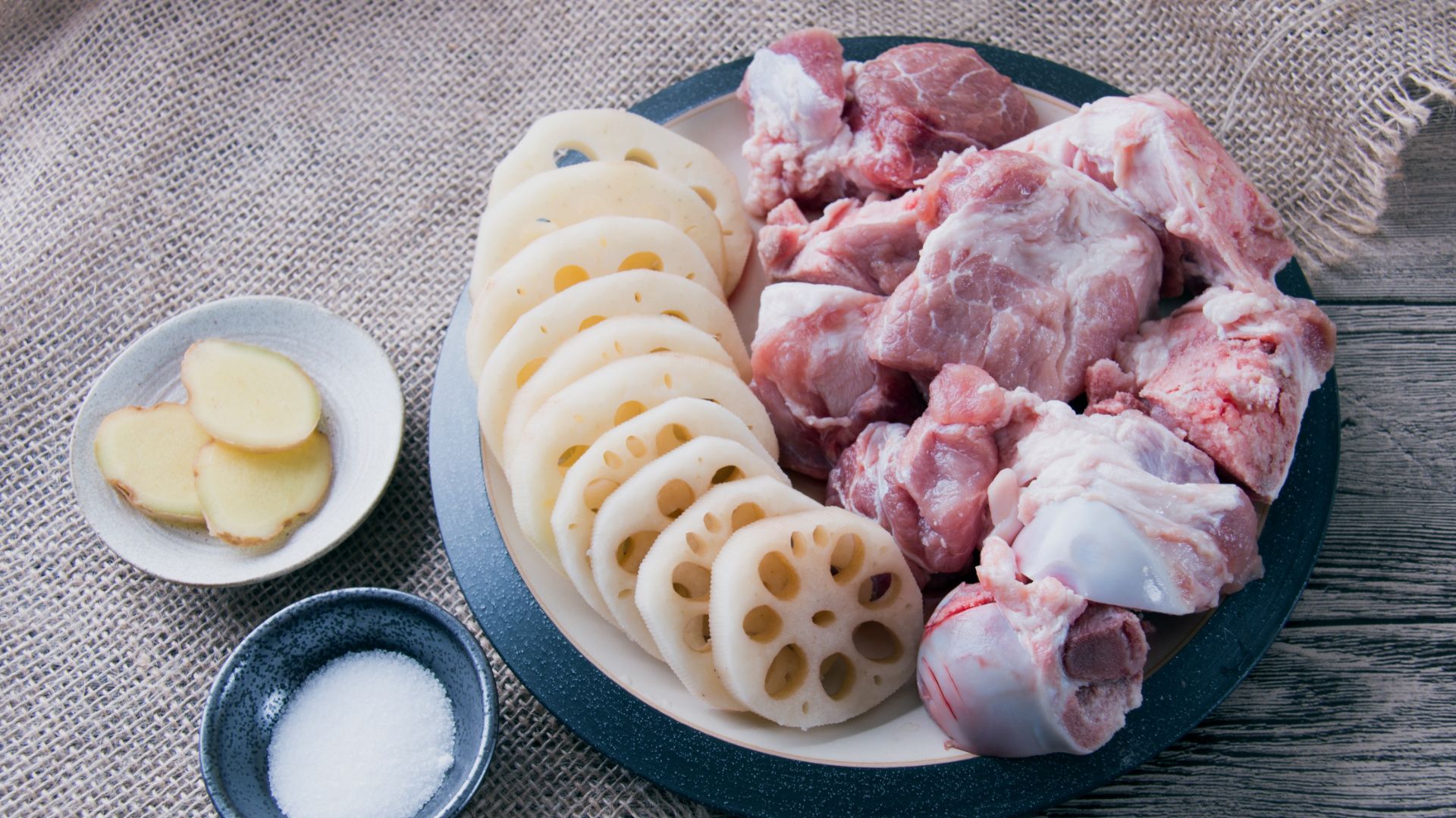 准备好所有材料,大骨洗净、剁成块,莲藕去皮切大块,姜洗净切片。